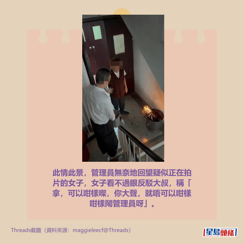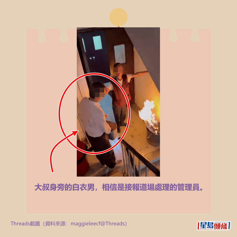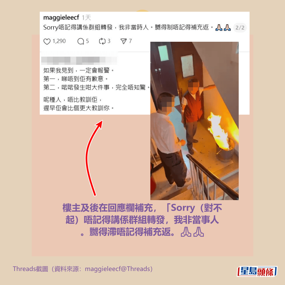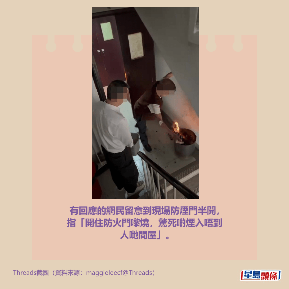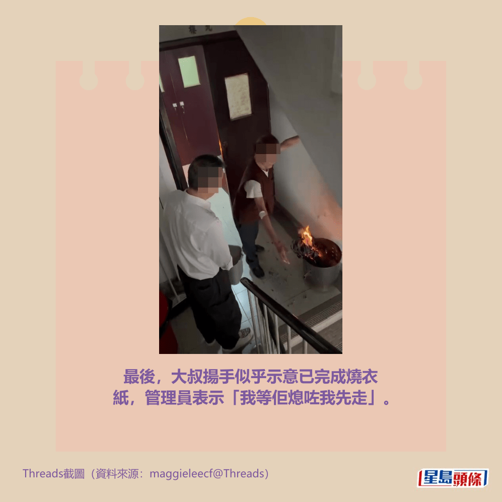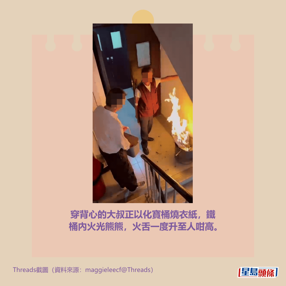 樓主前日(6日)在社交平台Threads轉載短片發帖,批評片中在後樓梯燒衣紙的大叔「無藥可救、四處遺禍」,感慨「敏感時期(宏福苑五級大火後不久)仲搞啲咁嘅嘢」。樓主及後在回應欄補充,「Sorry(對不起)唔記得講係群組轉發,我非當事人。嬲得滯唔記得補充返。🙏🏻🙏🏻