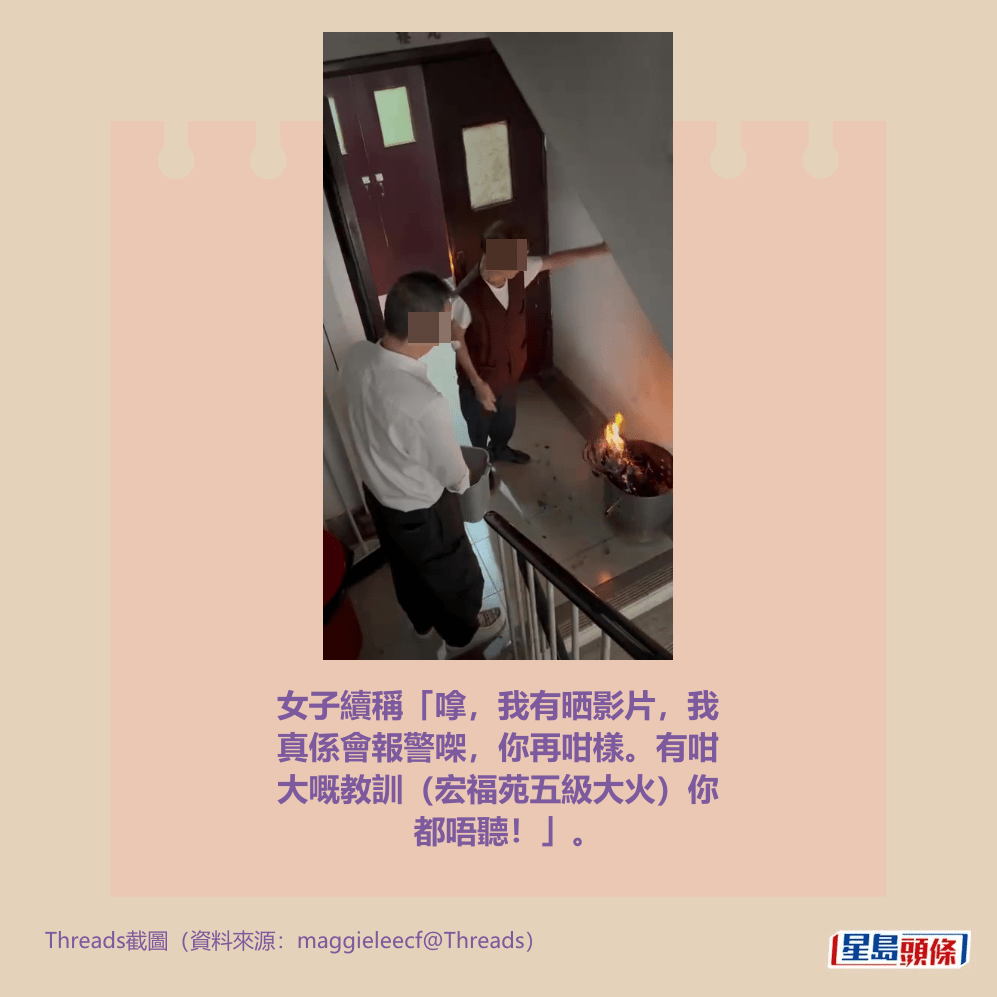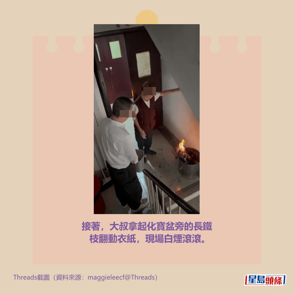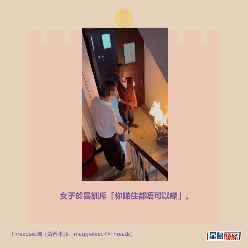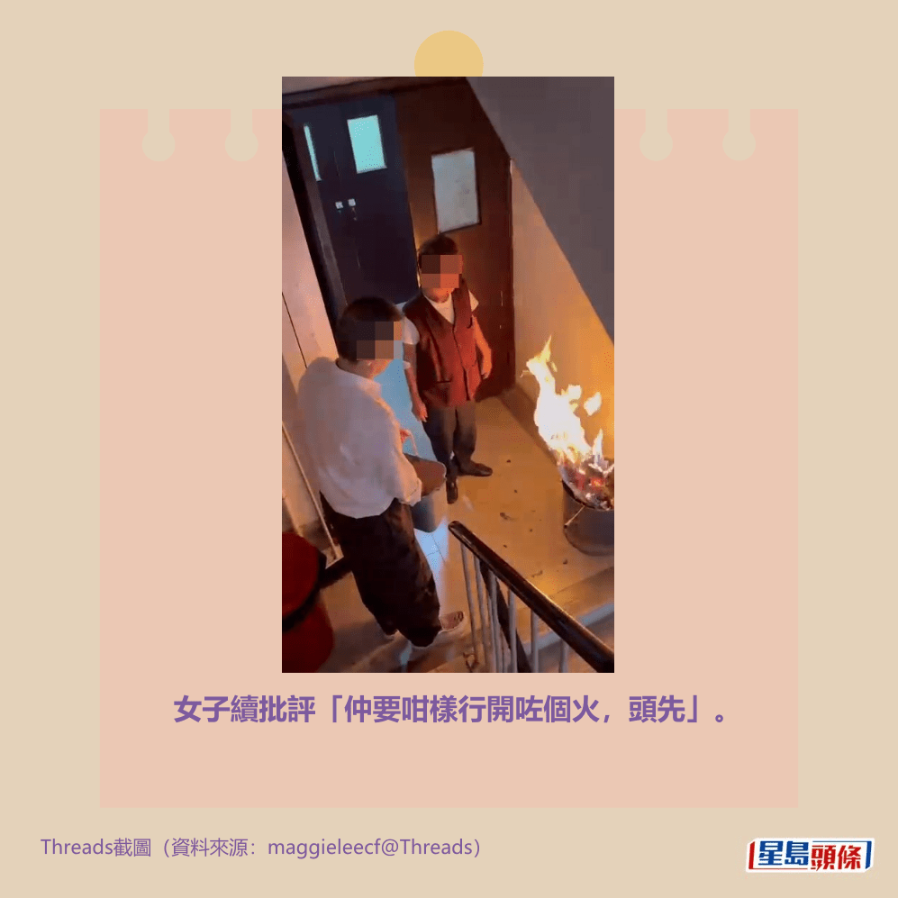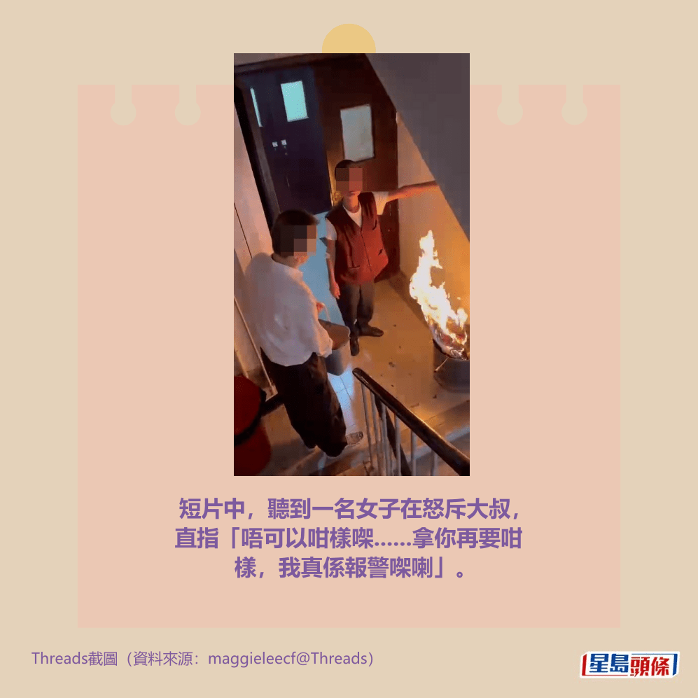 樓主前日(6日)在社交平台Threads轉載短片發帖,批評片中在後樓梯燒衣紙的大叔「無藥可救、四處遺禍」,感慨「敏感時期(宏福苑五級大火後不久)仲搞啲咁嘅嘢」。樓主及後在回應欄補充,「Sorry(對不起)唔記得講係群組轉發,我非當事人。嬲得滯唔記得補充返。🙏🏻🙏🏻