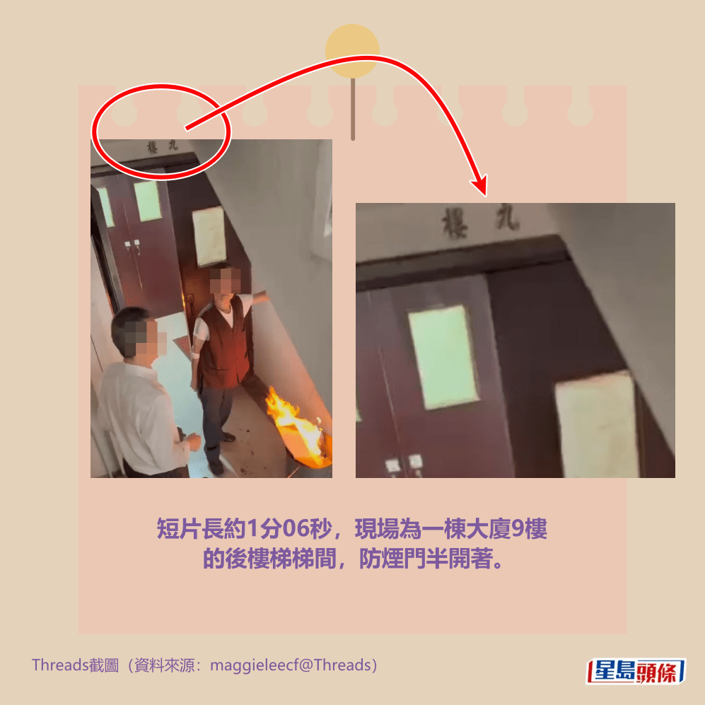 短片長約1分06秒,現場為一棟大廈9樓的後樓梯梯間,防煙門半開著。穿背心的大叔正以化寶桶燒衣紙,鐵桶內火光熊熊,火舌一度升至人咁高;大叔身旁的白衣男,相信是接報道場處理的管理員。