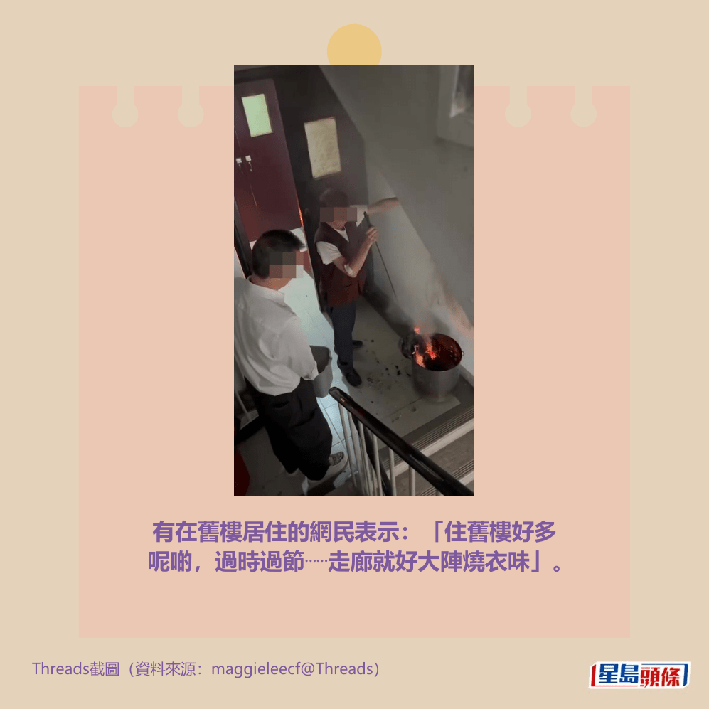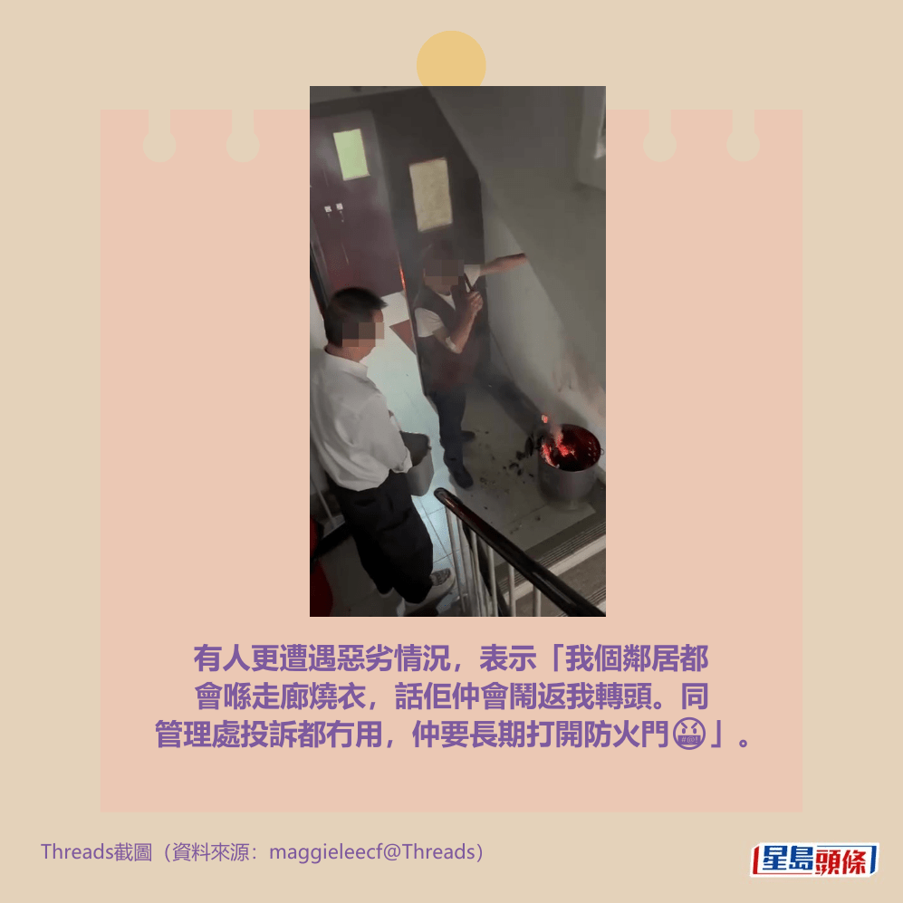 有在舊樓居住的網民表示:「住舊樓好多呢啲,過時過節⋯⋯走廊就好大陣燒衣味」;有人更遭遇惡劣情況,表示「我個鄰居都會喺走廊燒衣,話佢仲會鬧返我轉頭。同管理處投訴都冇用,仲要長期打開防火門🤬」。