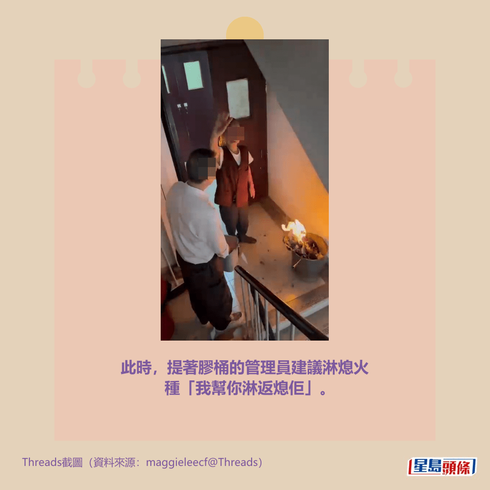 此時,提著膠桶的管理員建議淋熄火種「我幫你淋返熄佢」,但大叔提高聲調阻止,稱「唔好淋熄佢」。