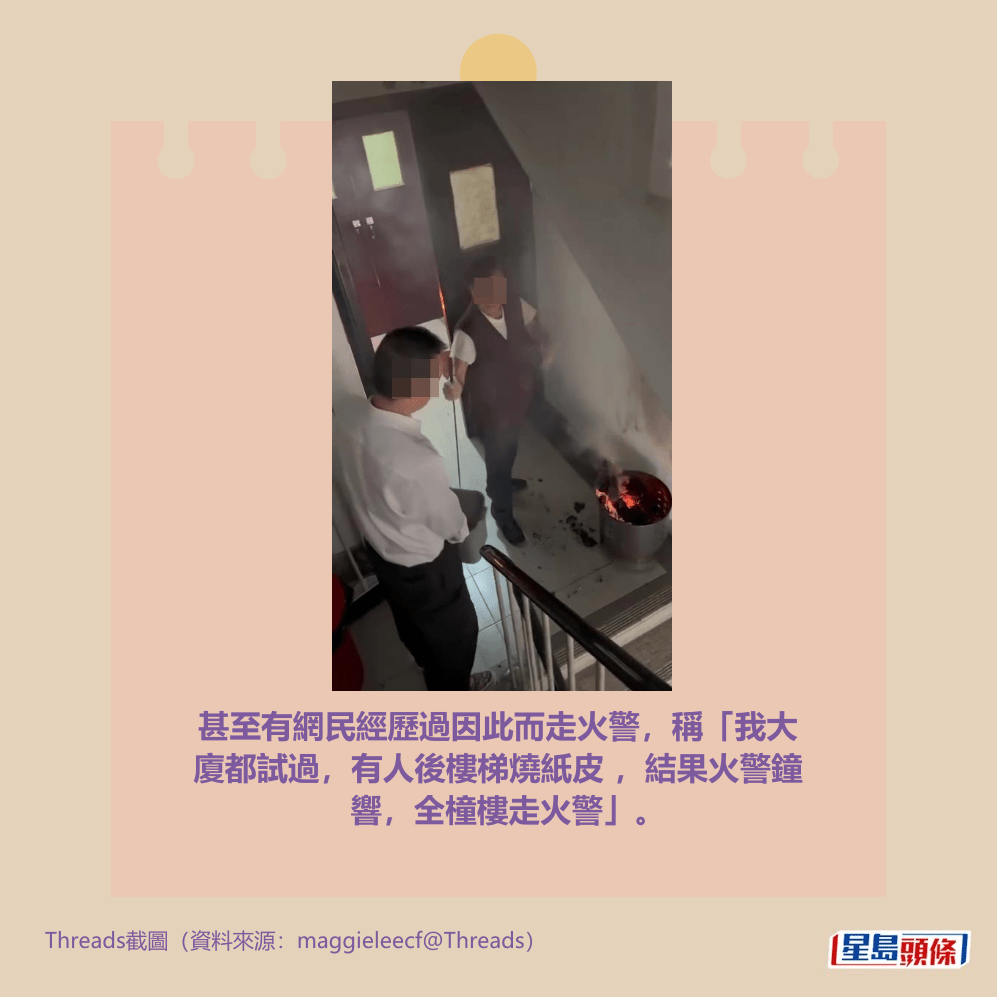 甚至有網民經歷過因此而走火警,稱「我大廈都試過,有人後樓梯燒紙皮 ,結果火警鐘響,全橦樓走火警」。