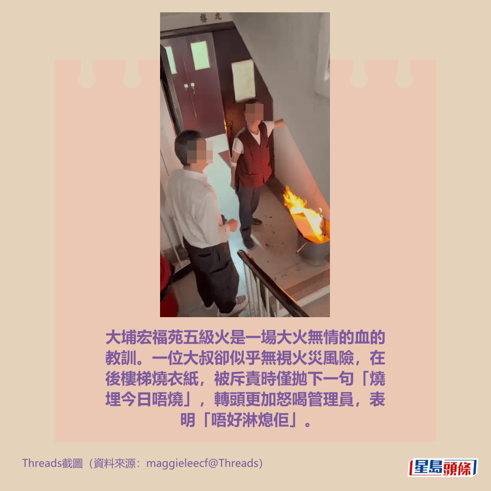 大埔宏福苑五級火是一場大火無情的血的教訓。一位大叔卻似乎無視火災風險,在後樓梯燒衣紙,被斥責時僅拋下一句「燒埋今日唔燒」,轉頭更加怒喝管理員,表明「唔好淋熄佢」。詳情見下圖及下文: