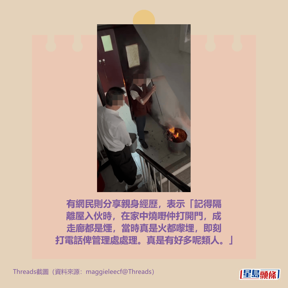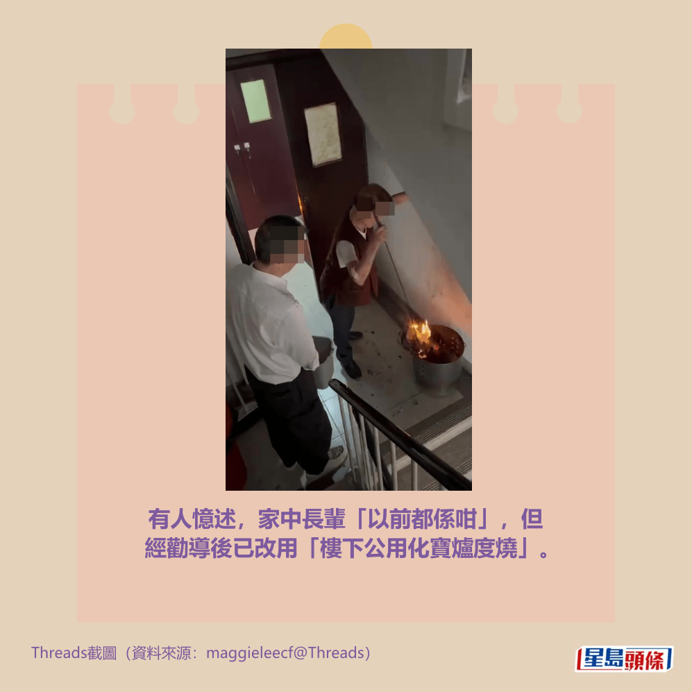 有人憶述,家中長輩「以前都係咁」,但經勸導後已改用「樓下公用化寶爐度燒」。有網民則分享親身經歷,表示「記得隔離屋入伙時,在家中燒嘢仲打開門,成走廊都是煙,當時真是火都嚟埋,即刻打電話俾管理處處理。真是有好多呢類人。」