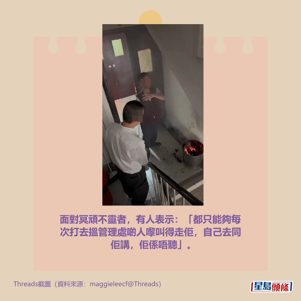 面對冥頑不靈者,有人表示:「都只能夠每次打去搵管理處啲人嚟叫得走佢,自己去同佢講,佢係唔聽」。有網民直接批評此行為是「縱火」,認為「燒衣就落街燒啦,喺後樓梯有乜事點算,佢喺度縱火」。