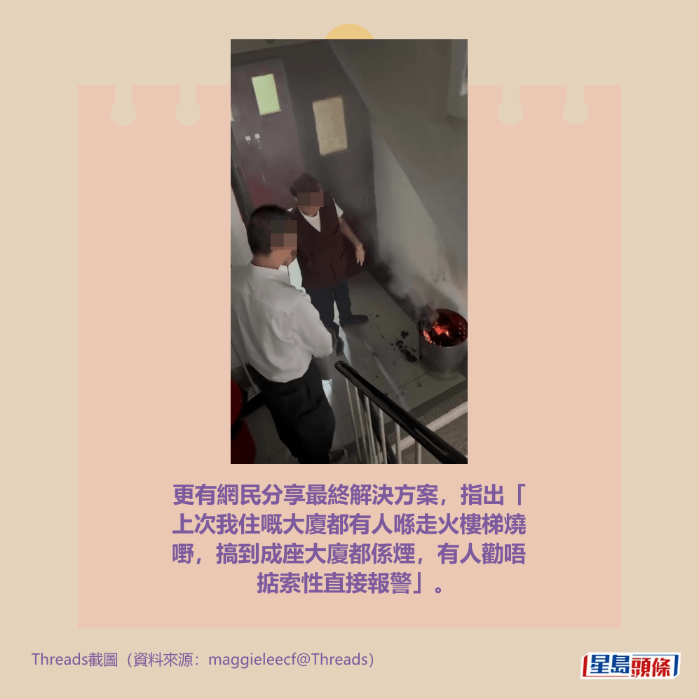 更有網民分享最終解決方案,指出「上次我住嘅大廈都有人喺走火樓梯燒嘢,搞到成座大廈都係煙,有人勸唔掂索性直接報警」。
