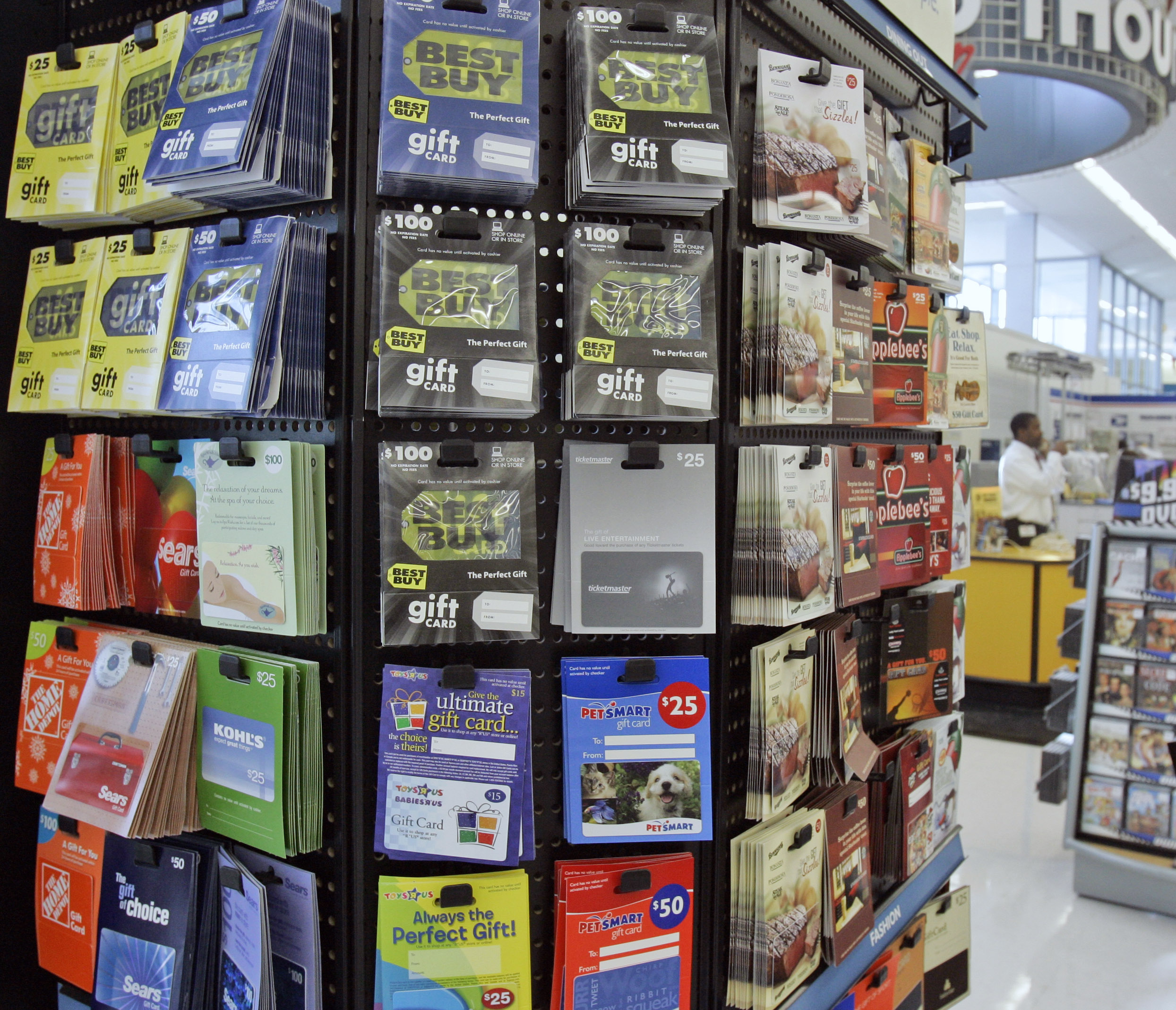 **FILE** In this Jan. 10, 2008 file photo, gift cards for various retailers are offered for sale at a supermarket in Omaha, Neb. An already weak holiday shopping season turned out to be even worse than expected for many of the nation’s retailers, who reported Thursday they had disappointing sales results for December. While January is expected to benefit from consumers’ redeeming their gift cards, Michael P. Niemira, chief economist at the ICSC, doesn’t see a big lift because he believes shoppers are being stingy even with their new found money. Retailers only record gift card sales when shoppers redeem them. (AP Photo/Nati Harnik, File)