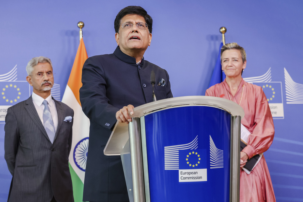 封面來源:2023年5月16日,星期二,比利時布魯塞爾歐盟總部。印度商工部長戈亞爾(Piyush Goyal,中)、歐盟主管數位事務執委維斯塔格(Margrethe Vestager,右)與印度外交部長蘇傑生(S. Jaishankar),在「歐盟—印度貿易與技術委員會」(Trade and Technology Council)的記者會上向媒體發表談話。美聯社