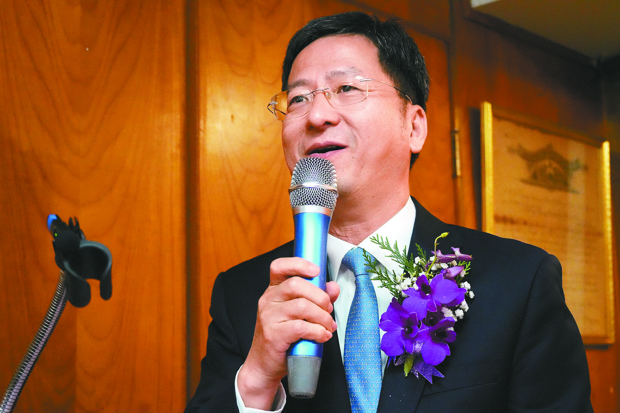 寧陽總會館舉行迎新送舊交接禮,中國駐舊金山總領事張建敏以監交人身分出席(大圖中央)並發表對台軍演重要講話。 記者黃偉江攝