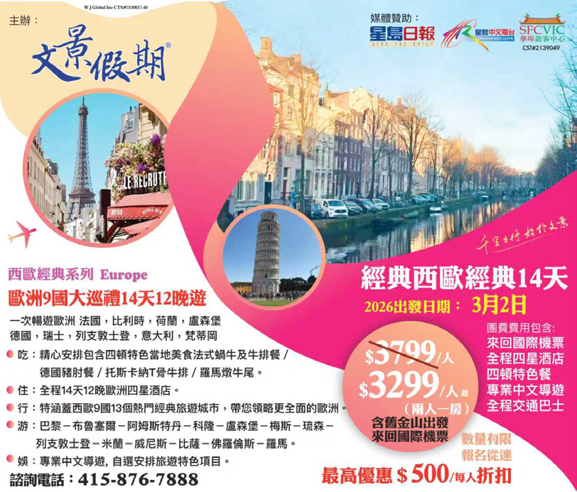 立即行動,撥打報名熱線415-876-7888,讓我們共同執筆,書寫屬於您的2026早春歐洲記憶。