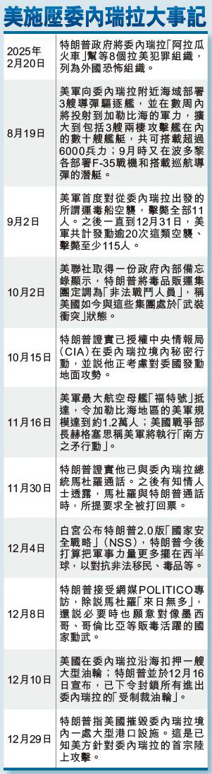 特朗普3日在社交網發文說:「美國已成功對委內瑞拉及其領導人、總統馬杜羅(Nicolas Maduro)發動一場大規模打擊。馬杜羅及其妻弗洛雷斯已被捕,並被押送離境。本次行動由美國執法機關聯合完成。」
