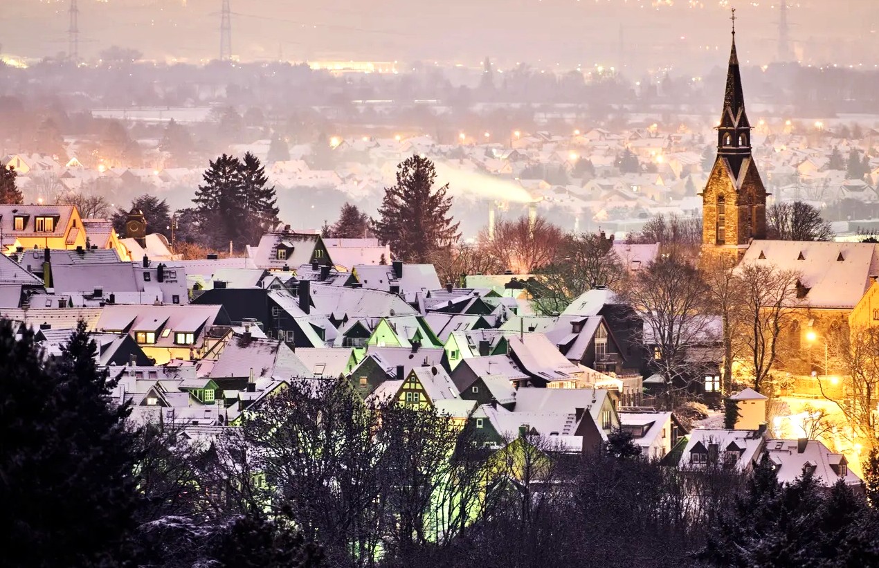 德國法蘭克福市郊,大部份房屋的屋頂都鋪滿白雪。圖:美聯社