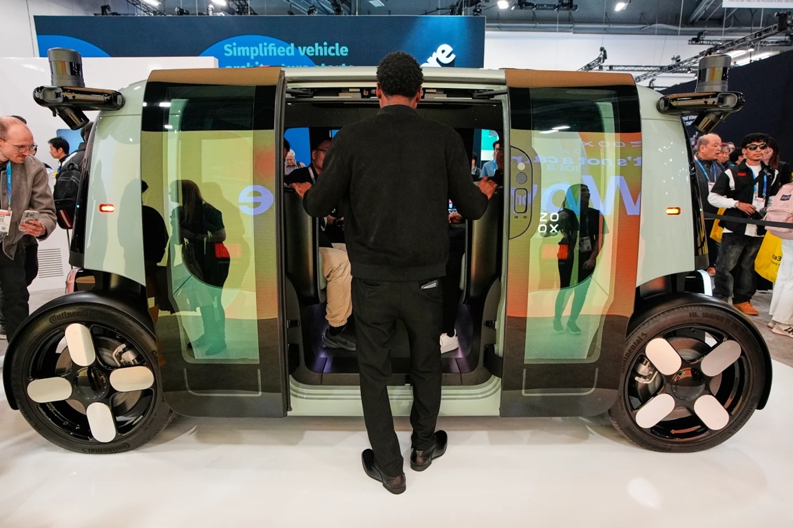 在拉斯維加斯舉行的國際消費電子展(CES)上,一名男子透過Zoox汽車的車門向外張望。美聯社