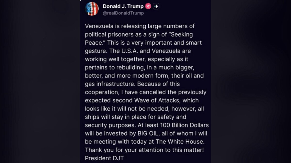 特朗普指出,委內瑞拉釋放大量政治犯,以尋求和平,是非常重要及明智的姿態,形容這是「尋求和平」的重要且明智舉動。美國與委內瑞拉正共同合作,特別是在重建與現代化石油及天然氣基礎設施方面,會以更大、更好及更現代化方式,重建當地石油及天然氣基礎設施。