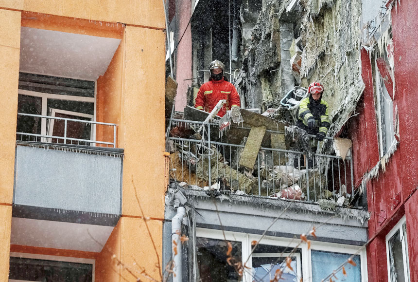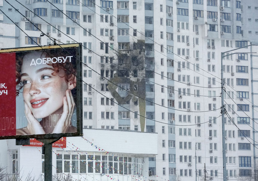 圖為俄羅斯可攜帶核彈頭的「榛樹」高超音速導彈系統部件,被放置在雪地。路透社 .c2/.c3 烏克蘭建築在無人機襲擊中被擊中。路透社