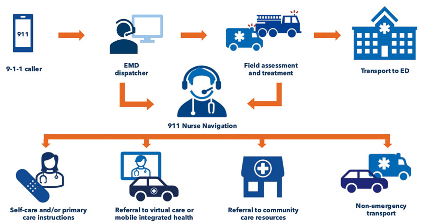 911護理導航員評估對呼叫者的醫療需求,為非緊急醫療需求的患者提供了一種選擇,幫助他們通過非緊急途徑獲得醫療服務。例如,導航員可以引導呼叫者前往診所或急診中心,並告知診所預計會有患者到訪,並在必要時安排交通工具。導航員也可以直接將呼叫者轉接至遠距醫療醫生,醫生可以提供網上醫療服務,並在必要時開處方。