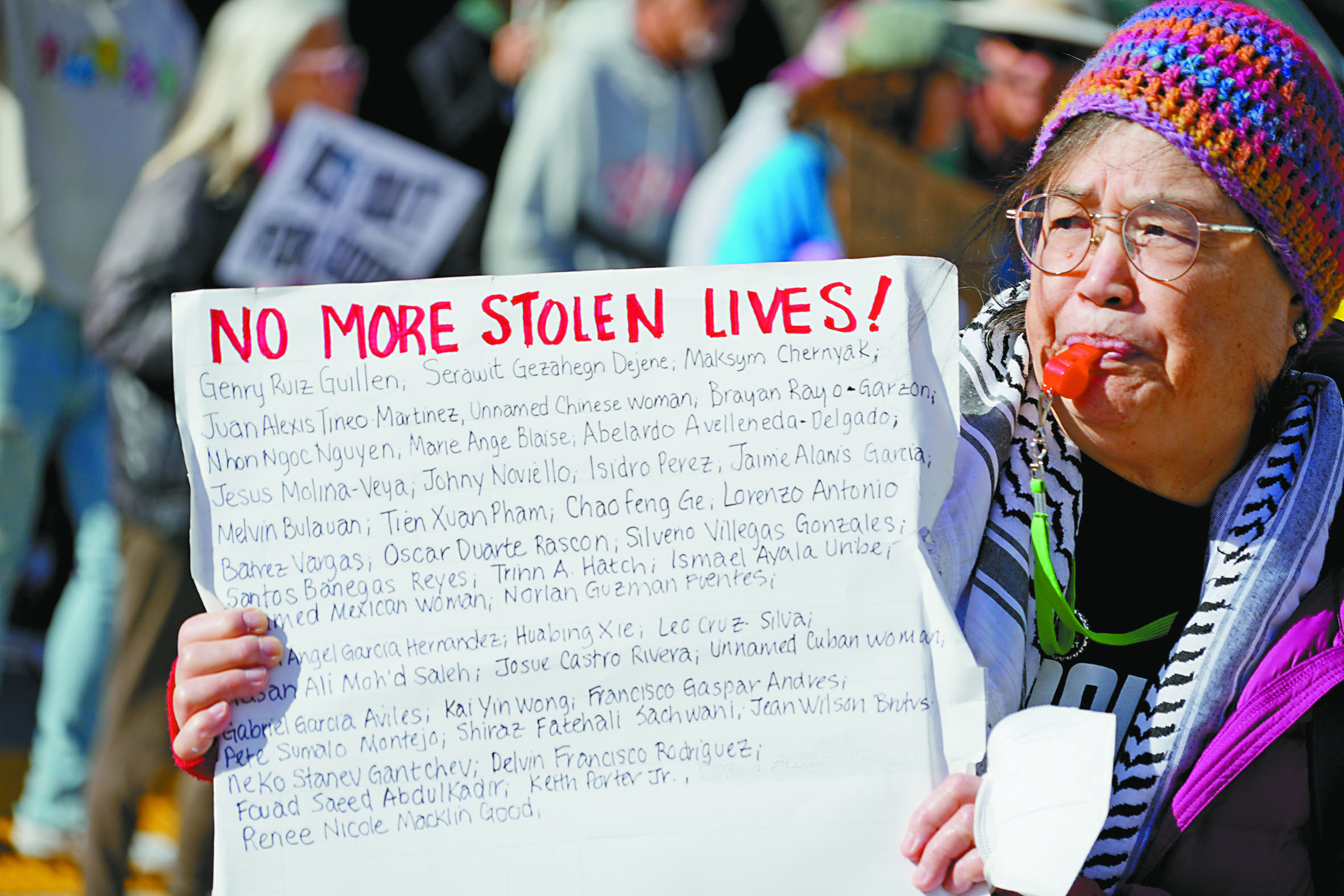退休幼教工作者金茲伯格(Nadine Ginzberg)說,主要因為古德被殺而上街抗議,並擔心特朗普政府削減社會服務。她說對政府的行動「感到恐懼,也為年輕一代感到心痛」。在海洋灘,數百名示威者排列成人體標語,拼出「IT WAS MURDER — ICE OUT」(這是謀殺——逐出ICE」。當地過往亦曾多次出現大型人體標語行動,包括「NO KINGS」(沒有國王)及「WE ARE FAMILIA」(我們都是一家人)。