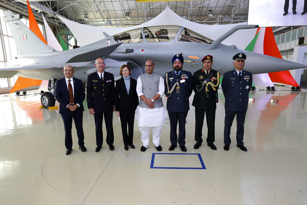 封面來源:2019年10月8日,星期二,法國西南部波爾多(Bordeaux)附近的梅里尼亞克(Merignac)。在達梭航空(Dassault Aviation)的工廠內,印度國防部長拉傑納特·辛格(Rajnath Singh,中左)與法國國防部長佛羅倫斯·帕利(Florence Parly,左三)及印度軍方官員合影。辛格正式接收了首架飆風戰鬥機(Rafale fighter jet);此前印度於2016年9月與法國政府及達梭航空簽署了一項協議,將採購36架飆風戰機。美聯社