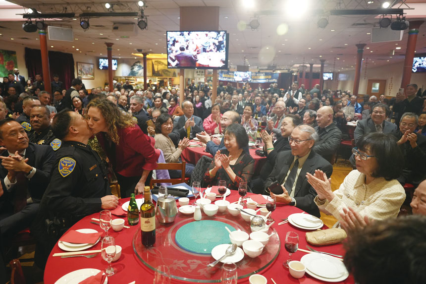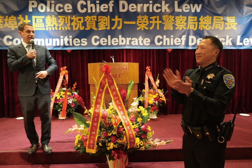 三藩市華人社區昨晚在華埠康年酒家舉行隆重晚宴,慶祝三藩市警察局史上第三位華裔局長劉力一(Derrick Leyi Lew)上任。市長羅偉、前市長威利·布朗(Willie Brown)、多位民選官員及社區領袖齊聚,見證這歷史時刻。