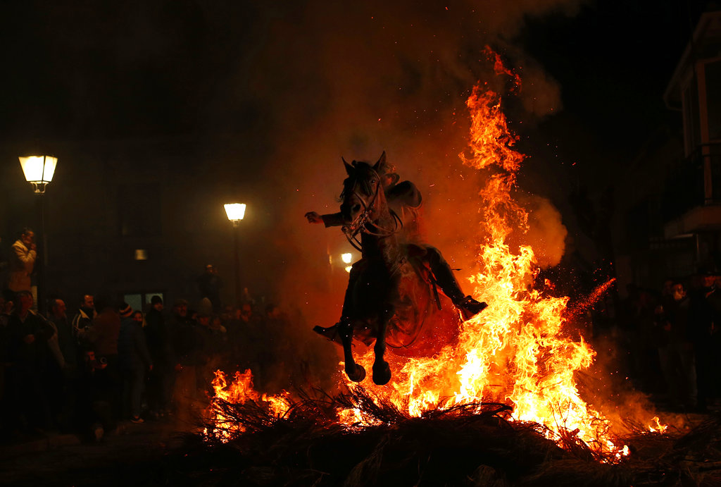 這項名為「拉斯盧米納里亞斯」(Las Luminarias)的烈火儀式,在人口僅500人的村莊聖巴托洛梅德皮納雷斯(San Bartolomé de Pinares)已有數百年歷史。當地人相信,騎手引導馬匹穿過街道中央的篝火,其產生的煙霧能夠淨化動物,保佑牠們來年平安健康。62歲的參與者帕特里西奧(Antonio Patricio)解釋:「過去人們相信煙霧能祝福用於耕作的馬匹和驢子,這是一種治療形式,能防止牠們生病。」慶祝活動由傍晚開始,巨大的樹枝堆被點燃,騎手們隨後引領馬匹躍過或繞過火焰。