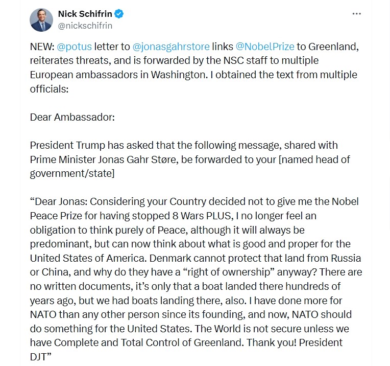 鑑於我曾阻止8場以上的戰爭,貴國也決定不授予我諾貝爾和平獎,我不再覺得有義務僅考慮和平,儘管和平永遠是我首要目標,但我現在可以思考什麼對美國有利。丹麥無法在俄羅斯或中國面前保護那片土地(意指格陵蘭),那麼他們憑什麼擁有所有權?