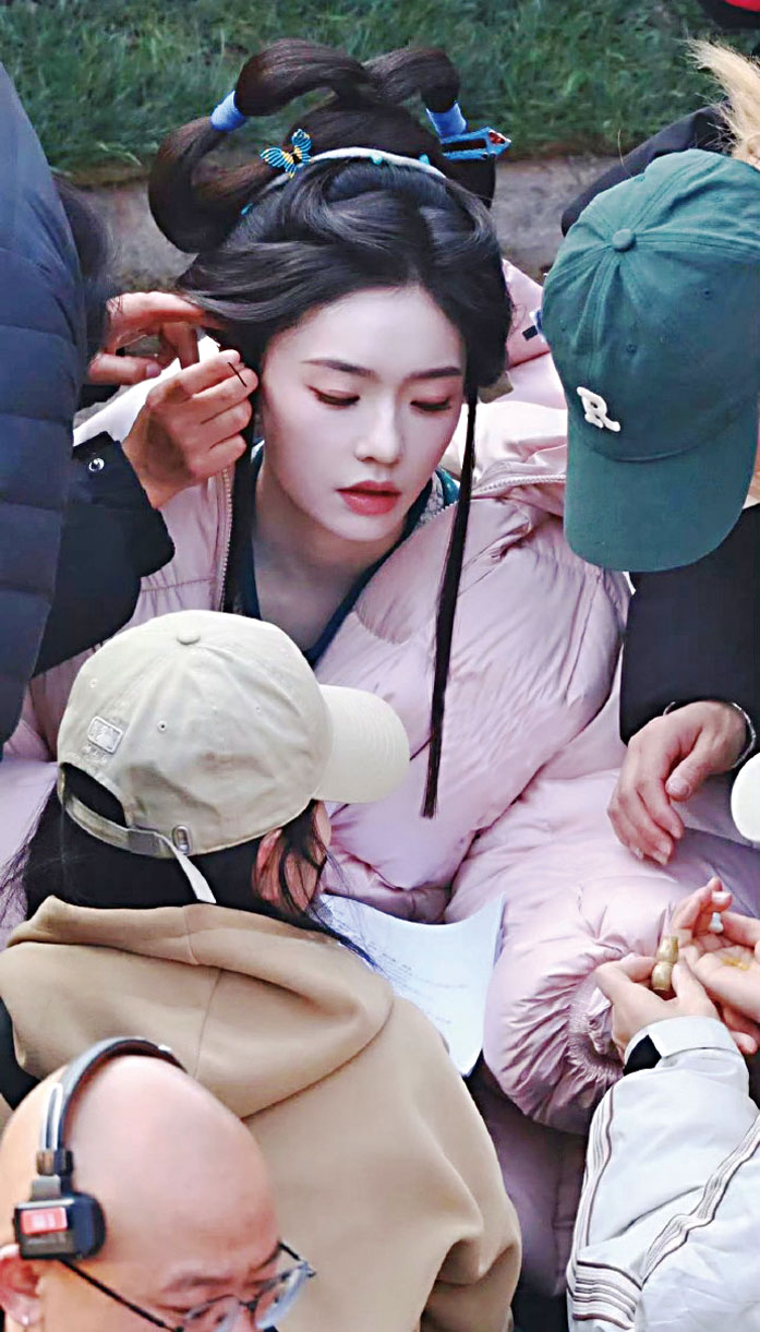 林允正在拍攝《歸鸞》,古裝扮相驚艷。網上圖片 .c2-c3 從畫面可見,工作人員拿出「速效救心丸」給林允服用。網上圖片