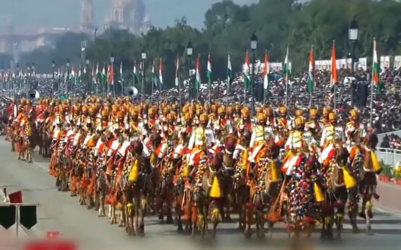 印度傳媒稱,今年國慶閱兵不同的地方是首次出現如駱駝等動物方陣。來源:電視畫面截圖