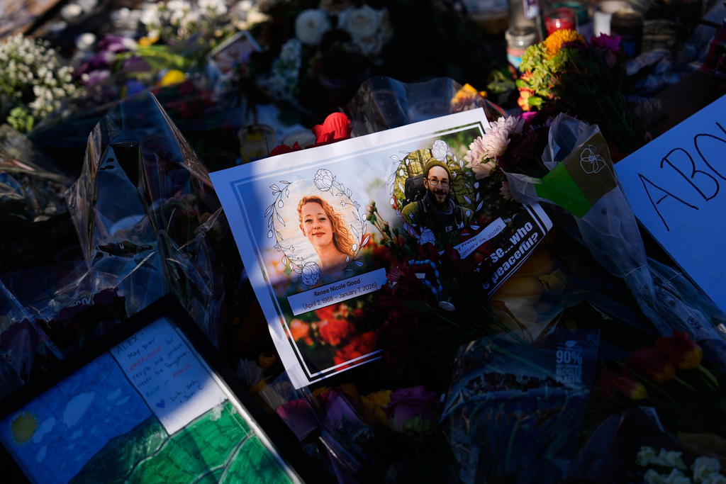 2026年1月27日星期二,在明尼阿波利斯,37歲的亞歷克斯·普雷蒂(Alex Pretti)週末被美國邊境巡邏隊警官槍殺的現場,展示了蕾妮·古德和普雷蒂的照片。美聯社