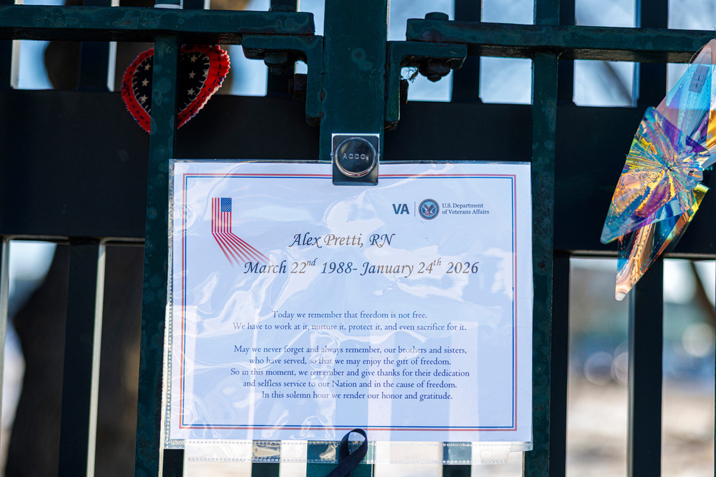 2026年1月27日星期二,在明尼阿波利斯,一塊紀念註冊護士亞歷克斯·普雷蒂的紀念牌匾懸掛在明尼阿波利斯退伍軍人醫院外的圍欄上。 美聯社