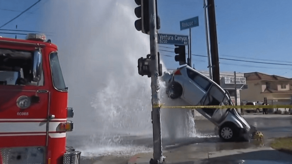 洛杉磯於周二(3日)清晨發生交通事故。一輛私家車行駛期間遭另一輛車擦撞,失控衝上路旁並輾過消防栓。消防栓隨即被撞毀,大量高壓水流噴湧而出,水柱從車底湧起,將整輛車托離地面,場面驚險。