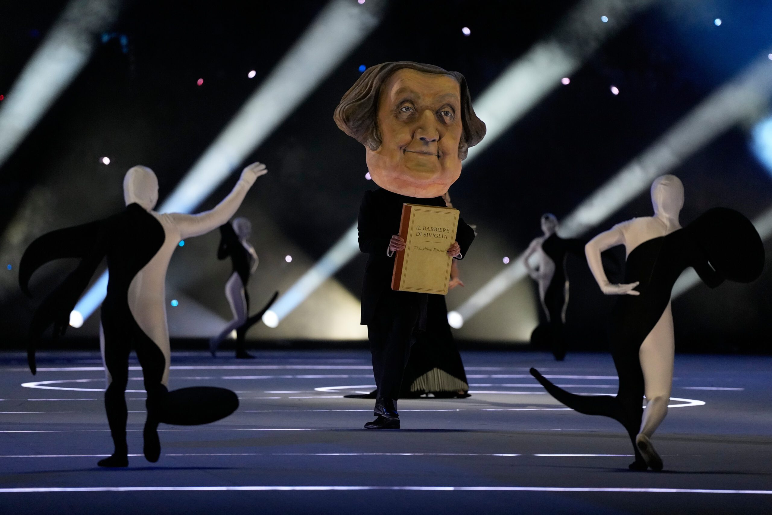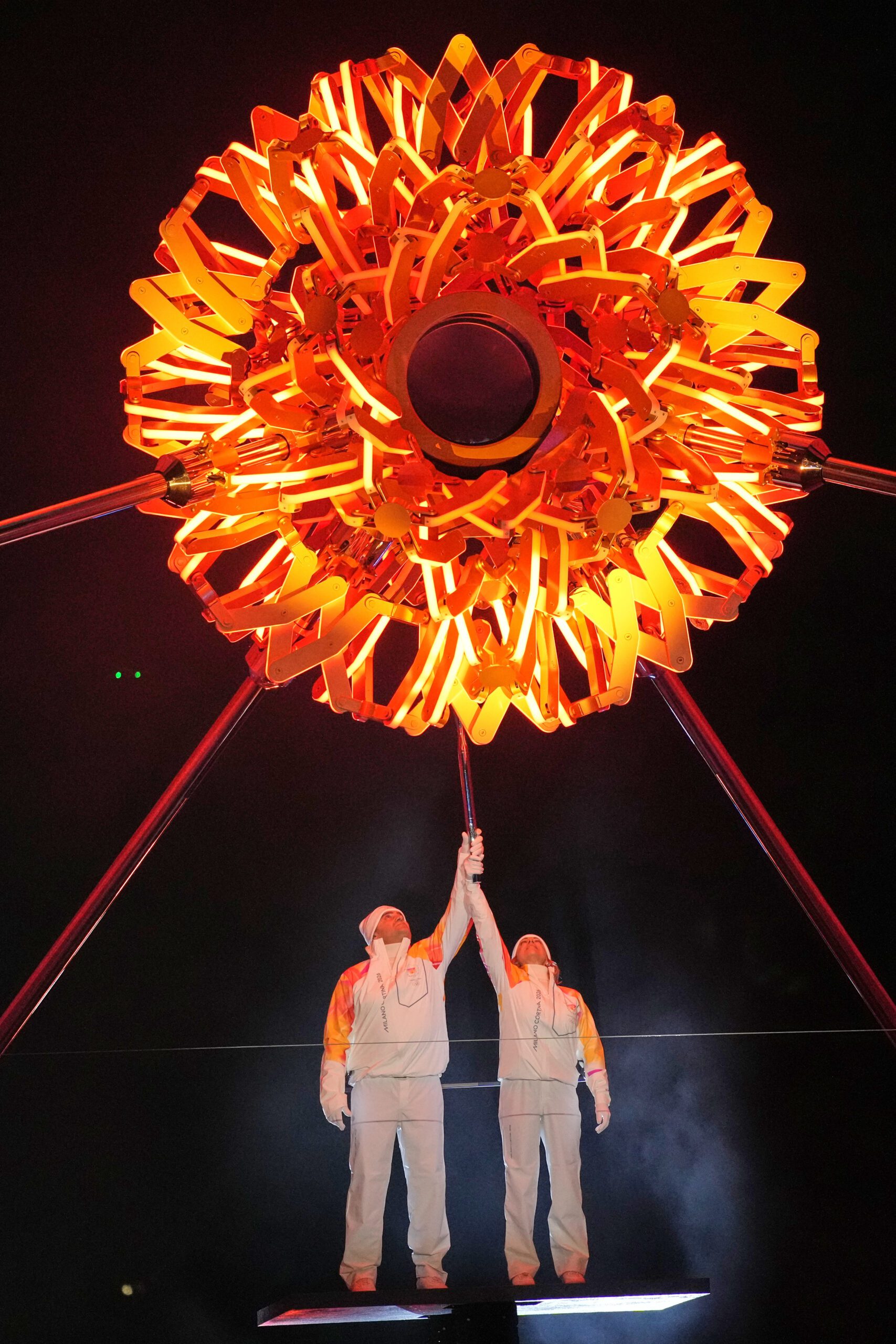 意大利前滑雪運動員Deborah Compagnoni與意大利前滑雪運動員Alberto Tomba在2026年冬季奧運會開幕典禮於米蘭和平拱門(Arco della Pace)點燃聖火。