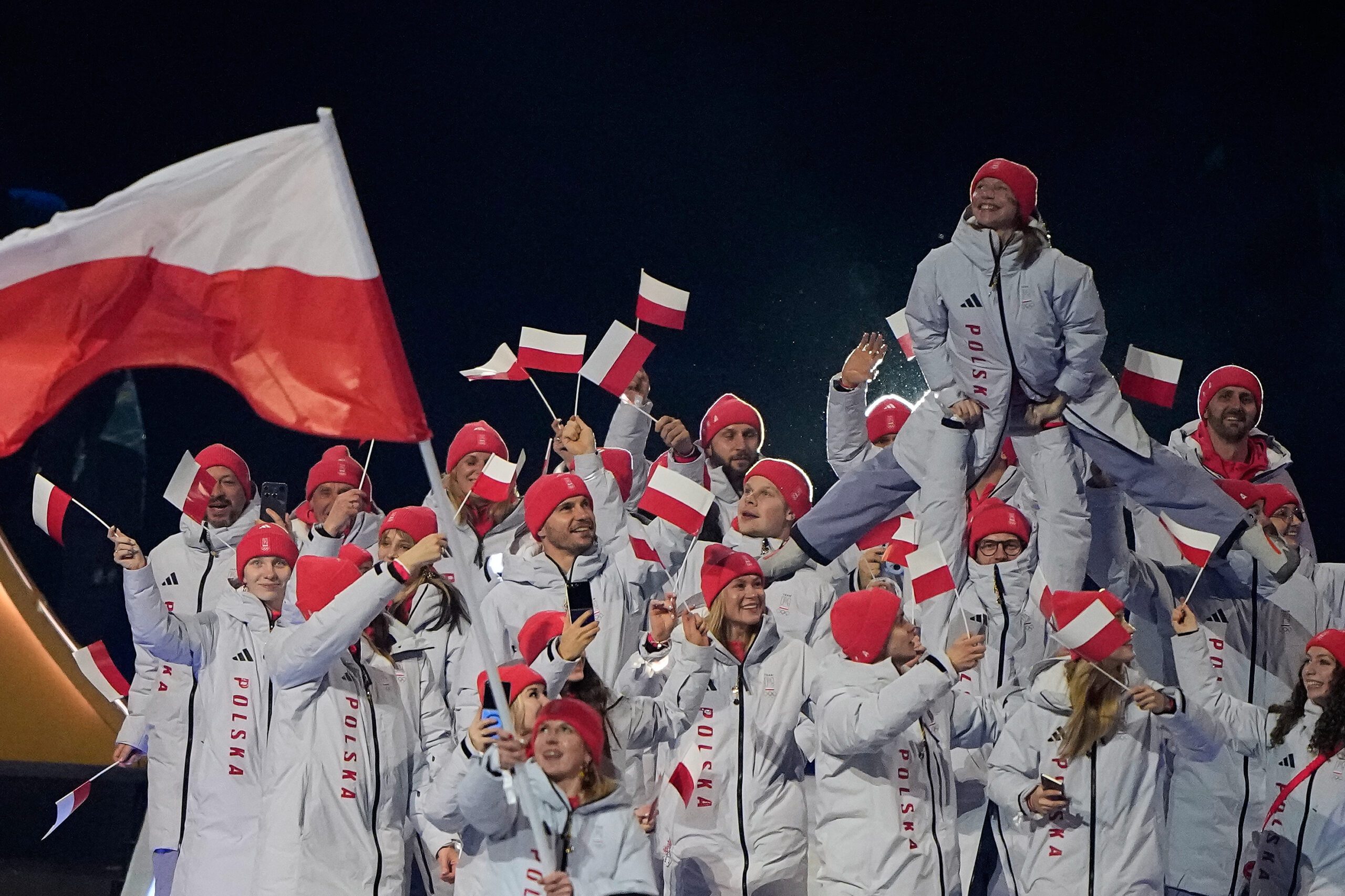 Nika Prevc 和 Domen Prevc,斯洛維尼亞旗手,參加2026年冬季奧運會運動員入場