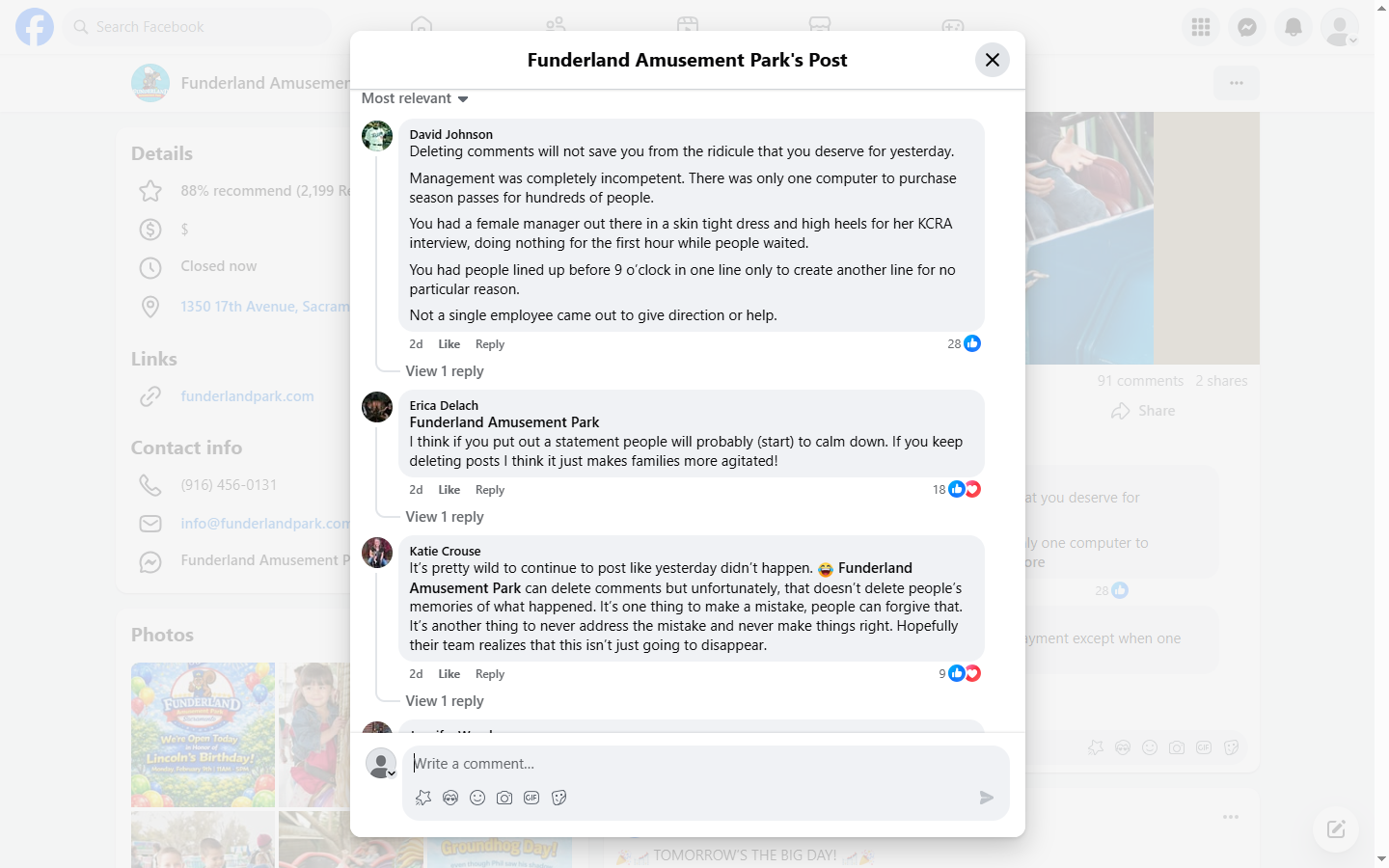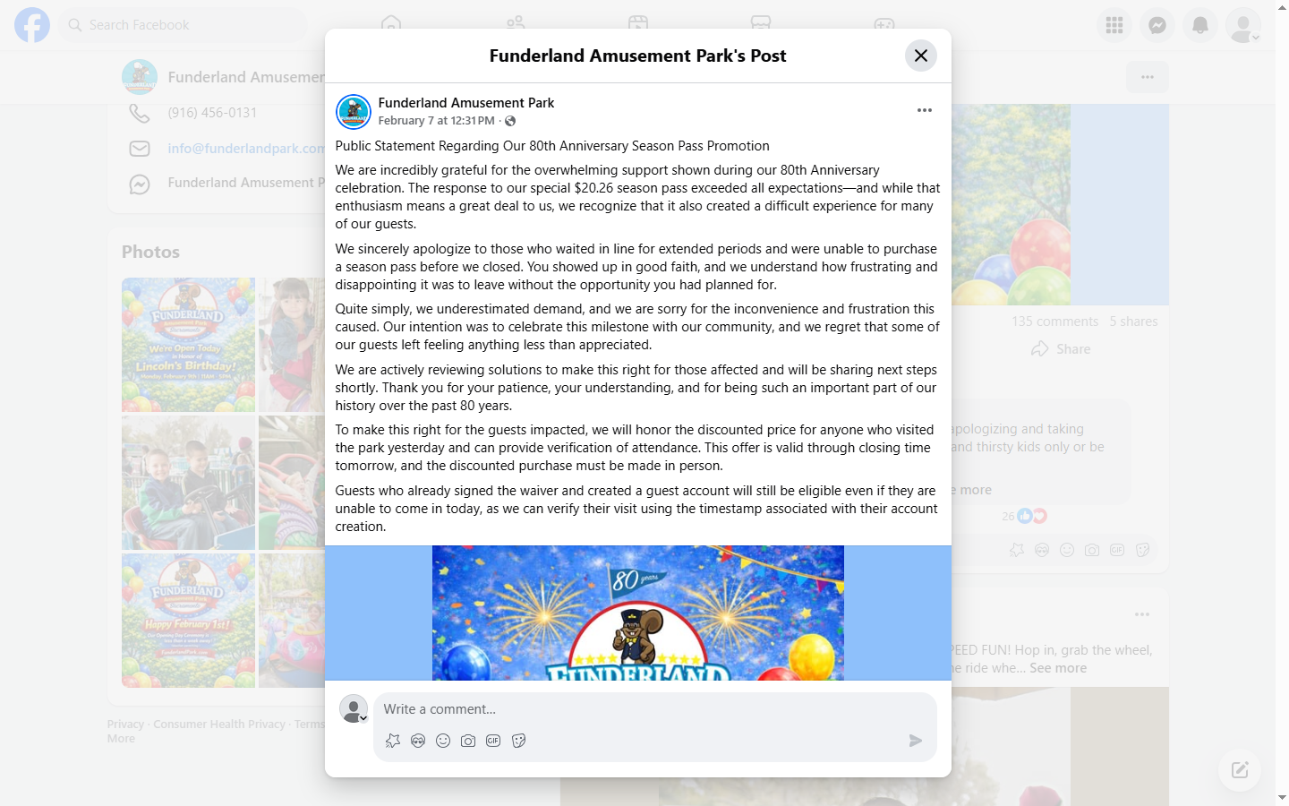 沙加緬度(Sacramento)Funderland 遊樂園為慶祝開園 80 週年,於 2 月 6 日推出大幅折扣的季票優惠,吸引大量家庭到場排隊。不少人等候超過 6 小時,最終在園區下午 5 時關門後仍未能入場,引發強烈不滿。