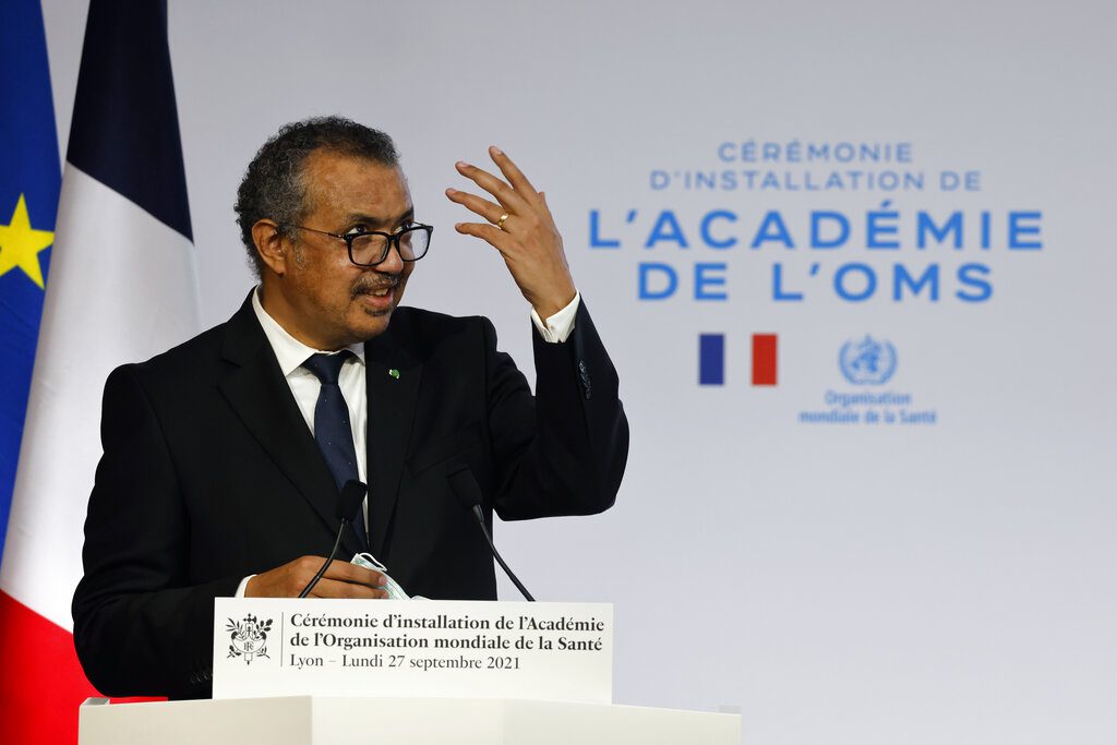 封面來源:世界衛生組織總幹事譚德塞於2021年9月27日星期一在法國中部城市里昂舉行的世界衛生組織學院開幕式上發表演說。美聯社