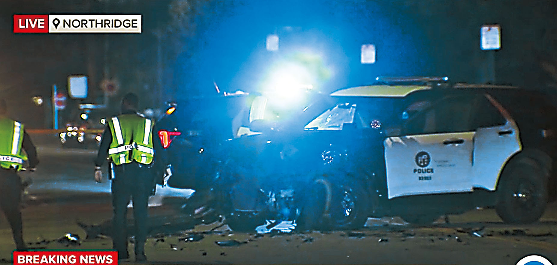 現場可見兩輛警車嚴重損毀。ABC7電視畫面