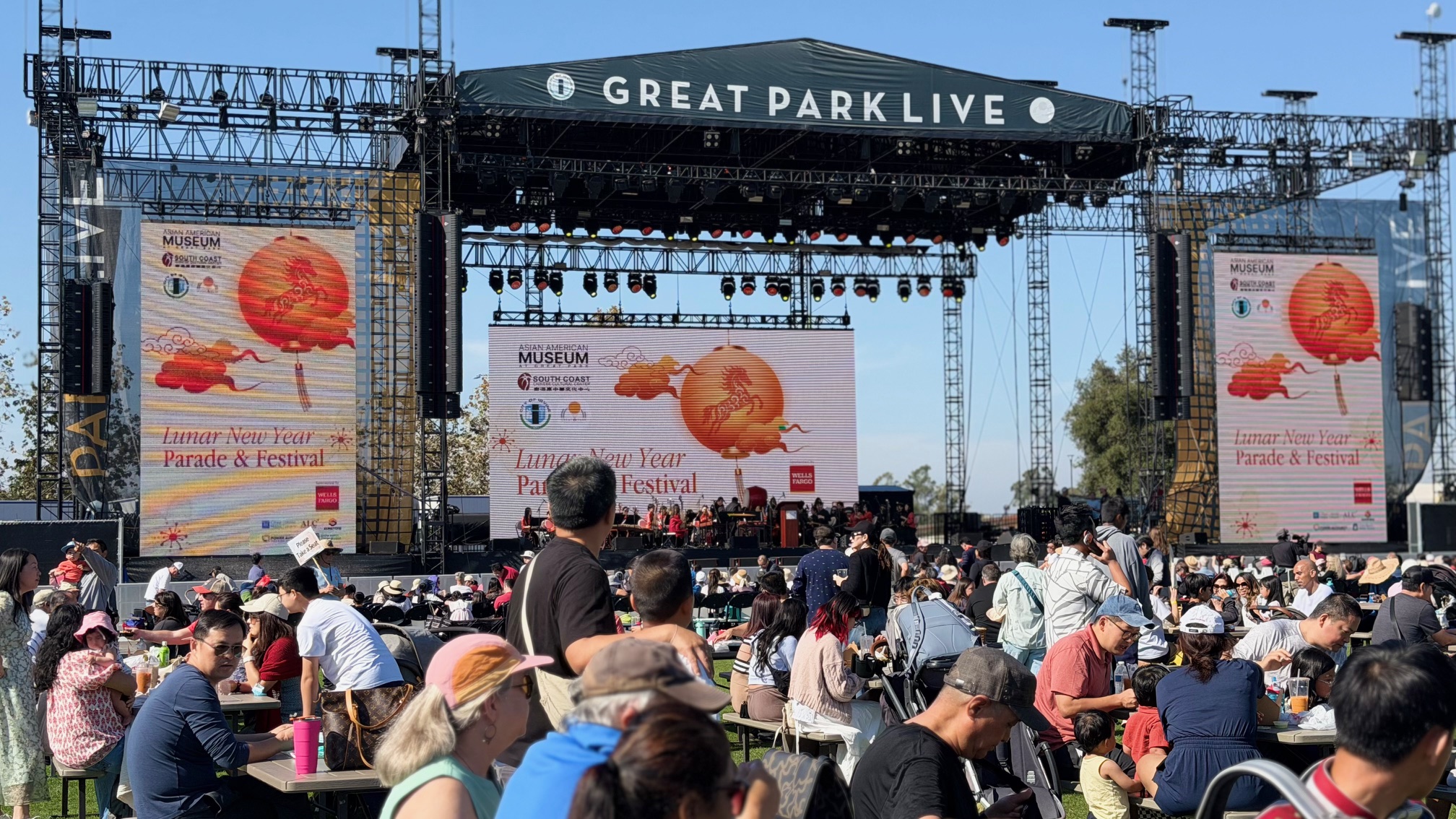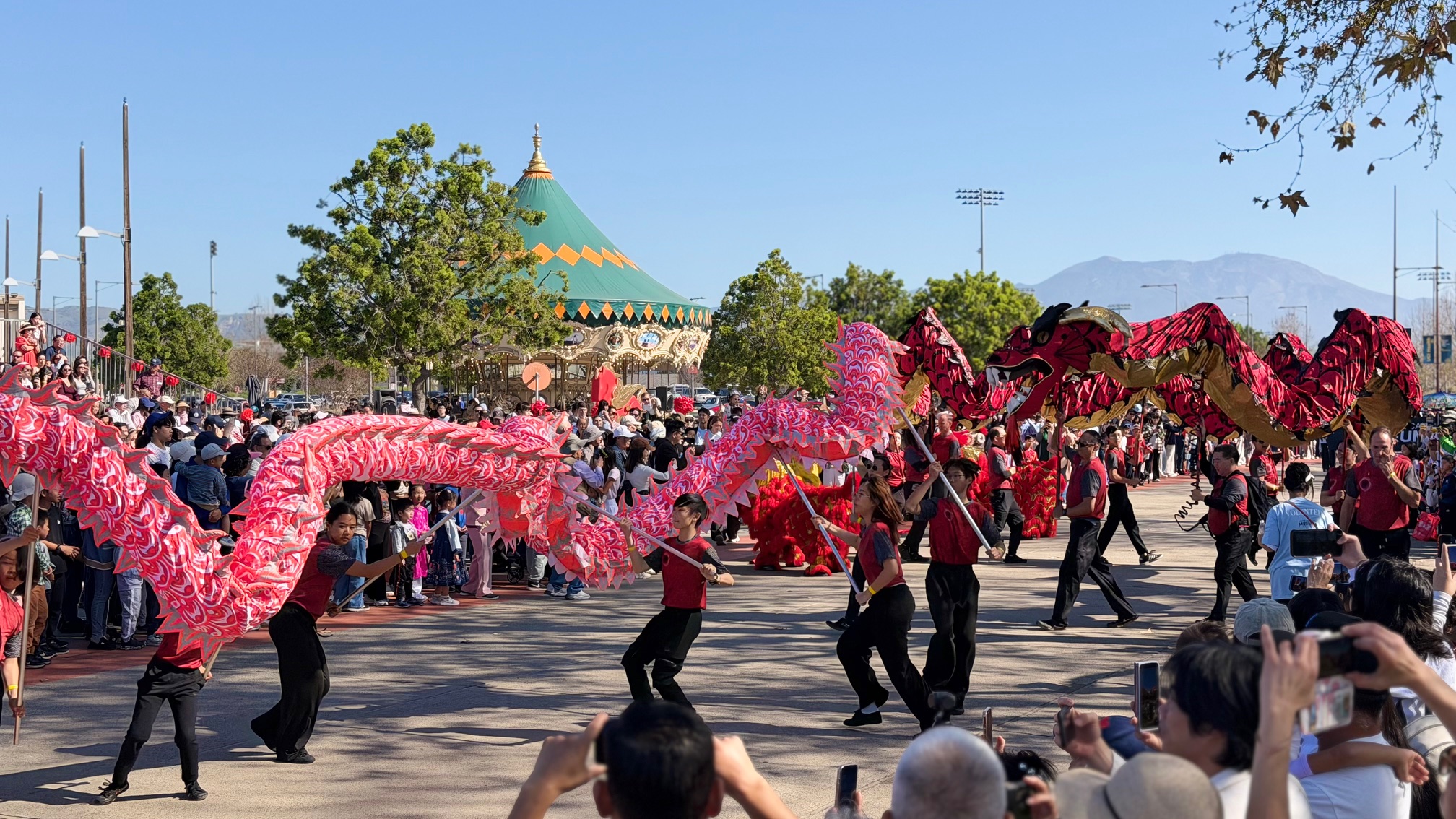 新春遊行結束後,嘉年華活動隨即在 Great Park Live 園區熱鬧登場。今年舞台節目豐富多元,由南海岸中華樂團指揮何彬率團揭開序幕,接續由爾灣沉浸式中文學校、越南水雲舞團、夏威夷草裙舞團、韓國彩帶鼓隊、日本太鼓團、印尼甘美朗樂團、南加州中華舞蹈團、Regulus Irvine 跆拳道示範隊、南海岸中華武術隊及爾灣融合獅團輪番演出,贏得觀眾熱烈掌聲。