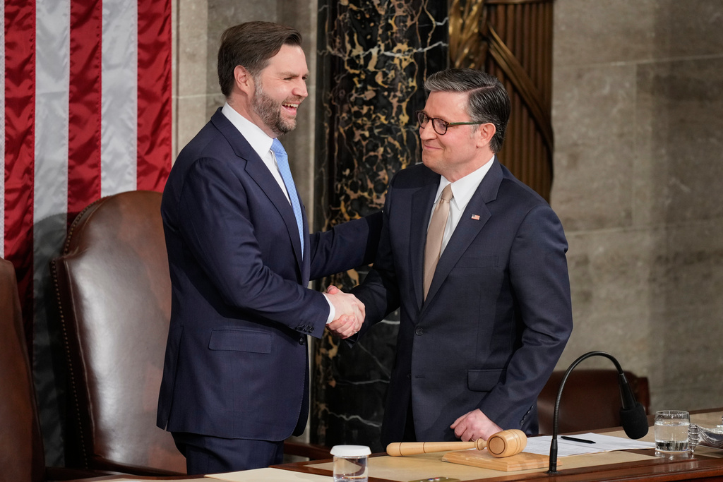 2026年2月24日,星期二,華盛頓。在美國總統特朗普於美國國會大廈眾議院會議廳舉行的國會聯席會議上發表國情咨文演說之前,可見副總統萬斯(JD Vance)與眾議院議長傑克遜(Mike Johnson)的身影。美聯社