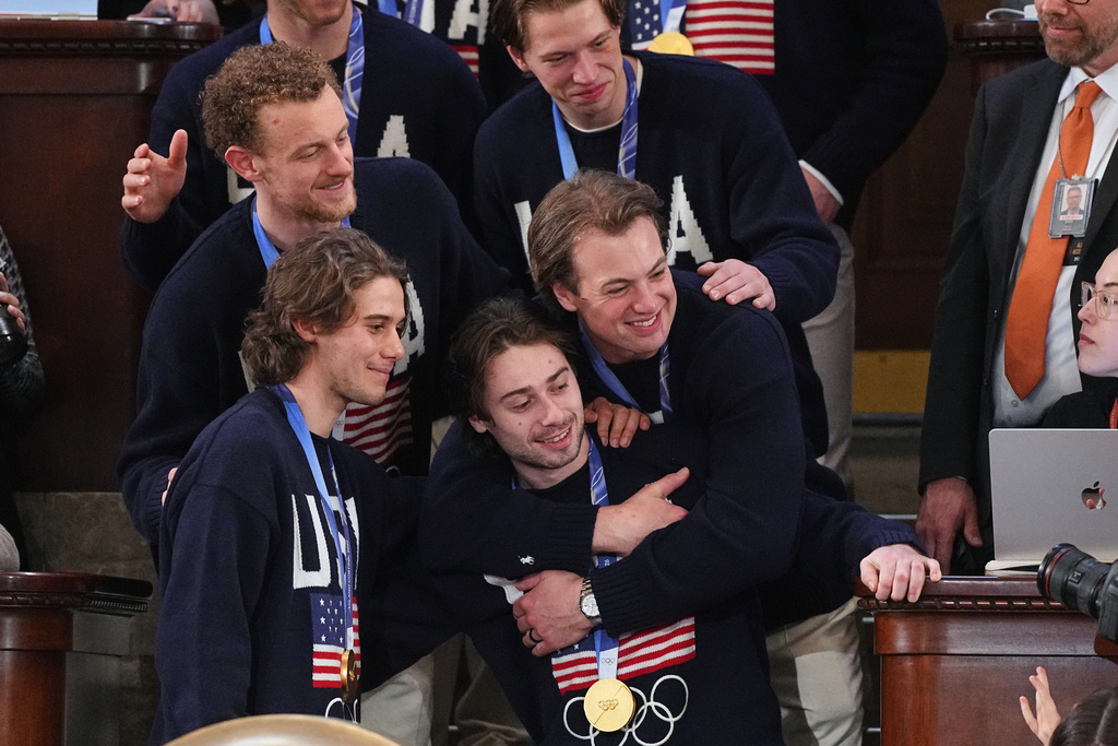 2026年2月24日,星期二,華盛頓。美國總統特朗普在美國國會大廈眾議院會議廳舉行的國會聯席會議上發表國情咨文演說時,美國奧運冰球隊成員出席旁聽。美聯社