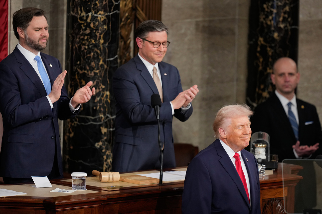2026年2月24日,星期二,華盛頓。在美國總統特朗普於美國國會大廈眾議院會議廳舉行的國會聯席會議上發表國情咨文演說時,副總統萬斯(JD Vance,左)與眾議院議長傑克遜(Mike Johnson)向他鼓掌致意。美聯社