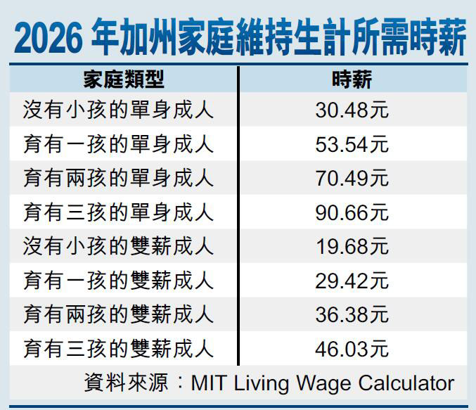 如果育有三孩的單親家長,維持生計的最低時薪就暴增至90.66元,是加州最低時薪的5倍以上。
