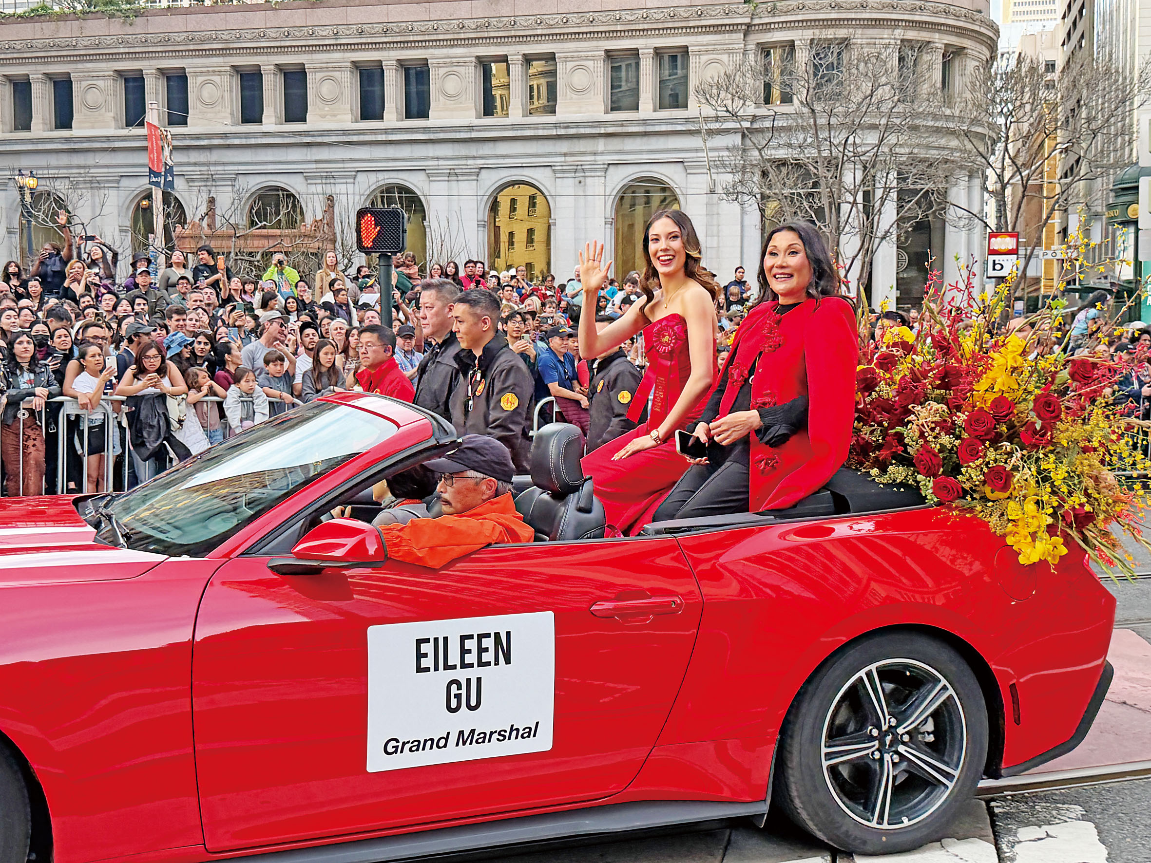 冬奧金牌得主谷愛凌昨晚擔任三藩市花車大巡遊總指揮。本報記者蘇婕雅攝