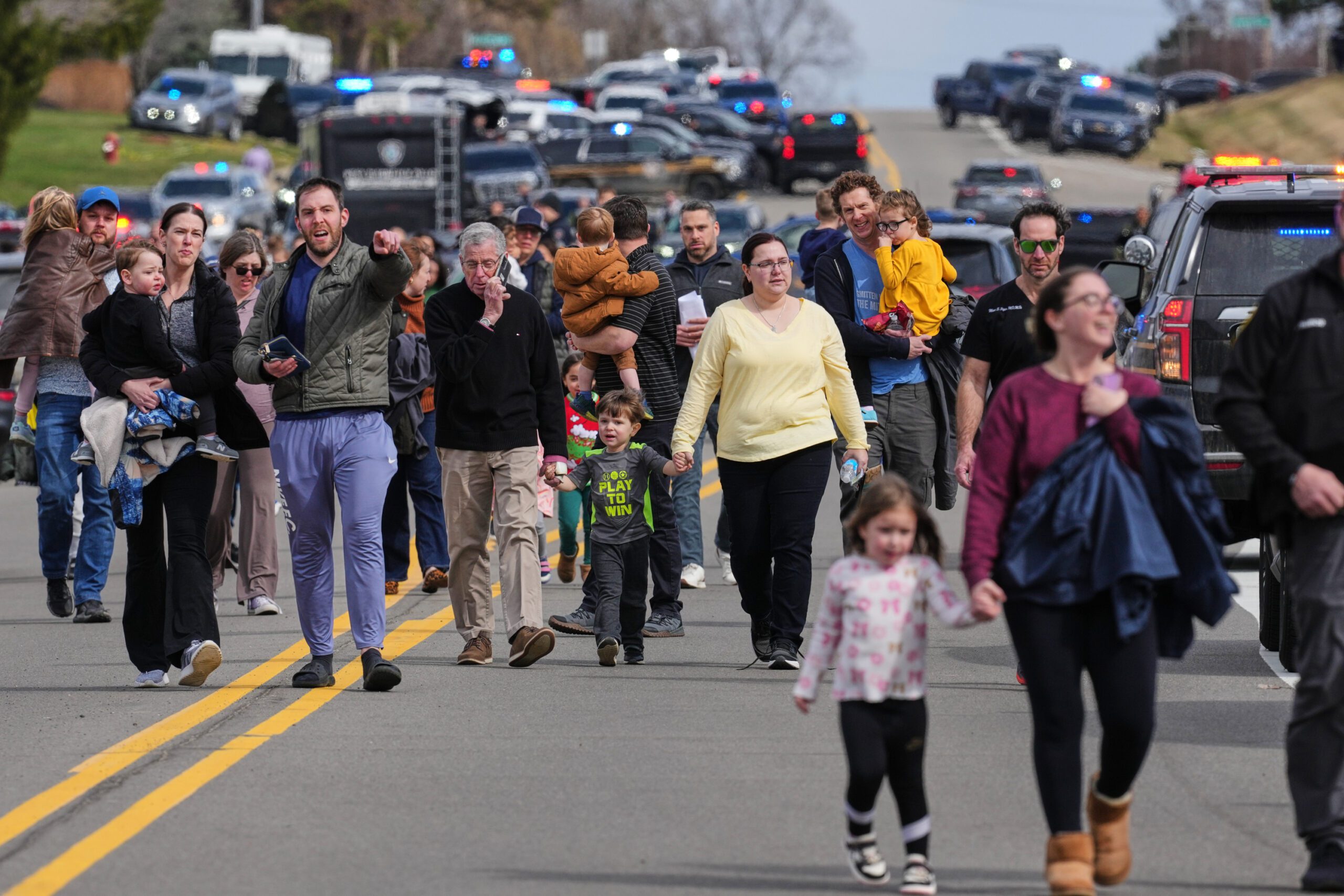 2026年3月12日星期四,在密西根州西布魯姆菲爾德鎮,執法人員護送帶著孩子的家庭離開以色列聖殿猶太教堂。美聯社