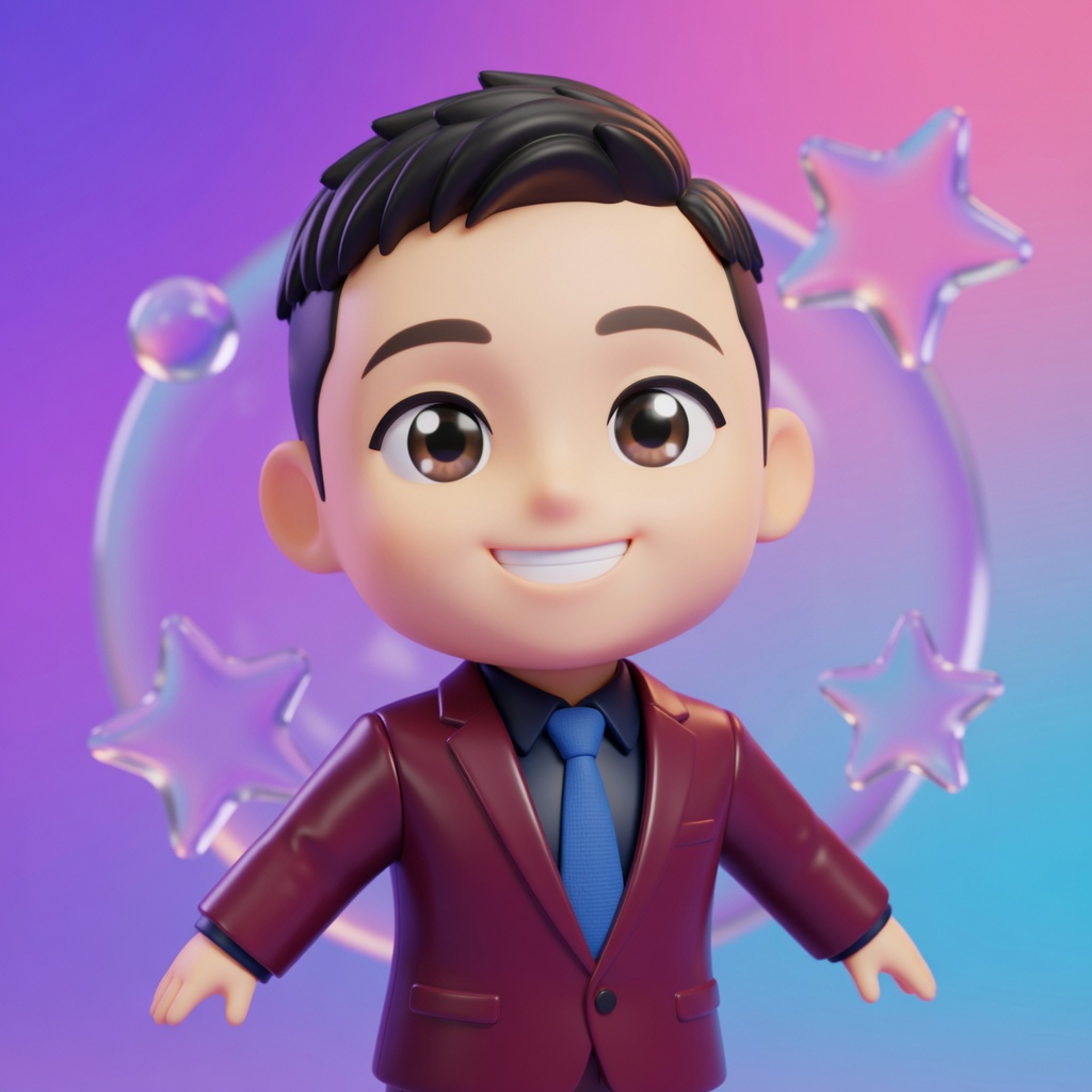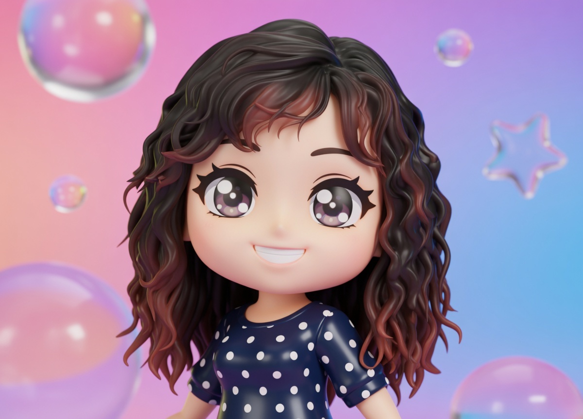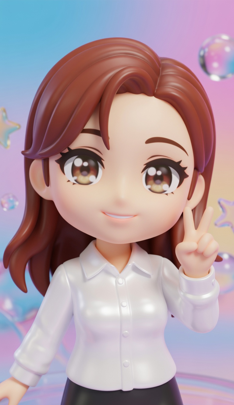 Convert the subject into a cute anime chibi character as a high-quality, glossy 3D model. Preserve original race, ethnicity, skin tone, facial likeness, hairstyle, hair color, and clothing colors. If clothing is unclear, add natural casual clothes so the character is always fully clothed. Maintain clear identity in chibi form.Use classic chibi proportions: huge head, tiny torso, simplified cute features, large expressive anime eyes. Adapt facial features to chibi style while staying recognizable.Frame tightly from torso up, head and upper body filling most of the frame. Character looks directly at camera in an energetic, expressive anime pose. Use dynamic angle (subtle tilt/off-axis) with slightly low, playful upward perspective like modern anime promo art.Render glossy, premium 3D style (Blender/collectible figure quality): smooth reflective surfaces, strong highlights, soft reflections, shiny toy-like materials. Bright anime shading, vibrant polished colors — clearly 3D, not 2D.Set against colorful gradient background with a few large, subtle, semi-transparent glossy shapes (bubbles, stars, rounded forms) floating softly — minimal and non-distracting.