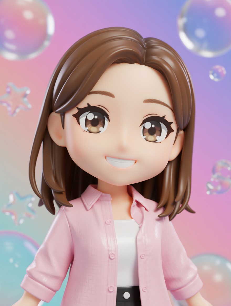 Transform the subjects into cute anime chibi characters rendered as a clean 3D model, while preserving the subject’s original race, ethnicity, skin tone, and recognizable facial likeness, including hairstyle, hair color, and clothing colors. If the input image does not clearly show clothing, generate appropriate casual clothing that naturally fits the character so the subject is always clothed. The character must remain clearly the same person with the same skin tone and ethnic appearance as the original input, translated into a chibi form. The character should have classic chibi proportions: a very large head, small torso, simplified cute facial features, and large expressive anime-style eyes. Translate the subject’s facial features into a chibi style while keeping their recognizable likeness. Frame the character from the torso up, with the camera slightly closer and cropped in, so the upper body and head fill most of the frame. The character should be looking directly into the camera, with an energetic and expressive anime-style pose. Use a slightly dynamic camera angle, such as a subtle tilt or off-axis perspective, similar to modern anime promotional artwork. The camera can be slightly lower than the character’s face, creating a playful upward angle that makes the character feel lively and engaging. Render the character as a high-quality glossy 3D anime-style model, similar to a polished Blender render or premium collectible figure. The materials should be smooth, reflective, and toy-like, with strong highlights, soft reflections, and shiny surfaces. The overall look should clearly resemble a 3D rendered character, not a flat 2D illustration. Use bright anime-style shading with vibrant but polished colors, giving the character a premium anime aesthetic. Place the character in front of a colorful gradient background. Behind the character, include a small number of large, translucent decorative shapes such as bubbles, stars, or rounded forms. These shapes should appear semi-transparent, glossy, and subtle, similar to clear acrylic or glass, softly floating in the background without drawing attention away from the character. The background elements should remain light, minimal, and softly visible, acting as stylish accents rather than prominent objects. The final image should look like a dynamic, glossy 3D chibi character render, with polished materials, vibrant colors, and a premium collectible aesthetic, while clearly maintaining the subject’s original race, skin tone, and recognizable identity.