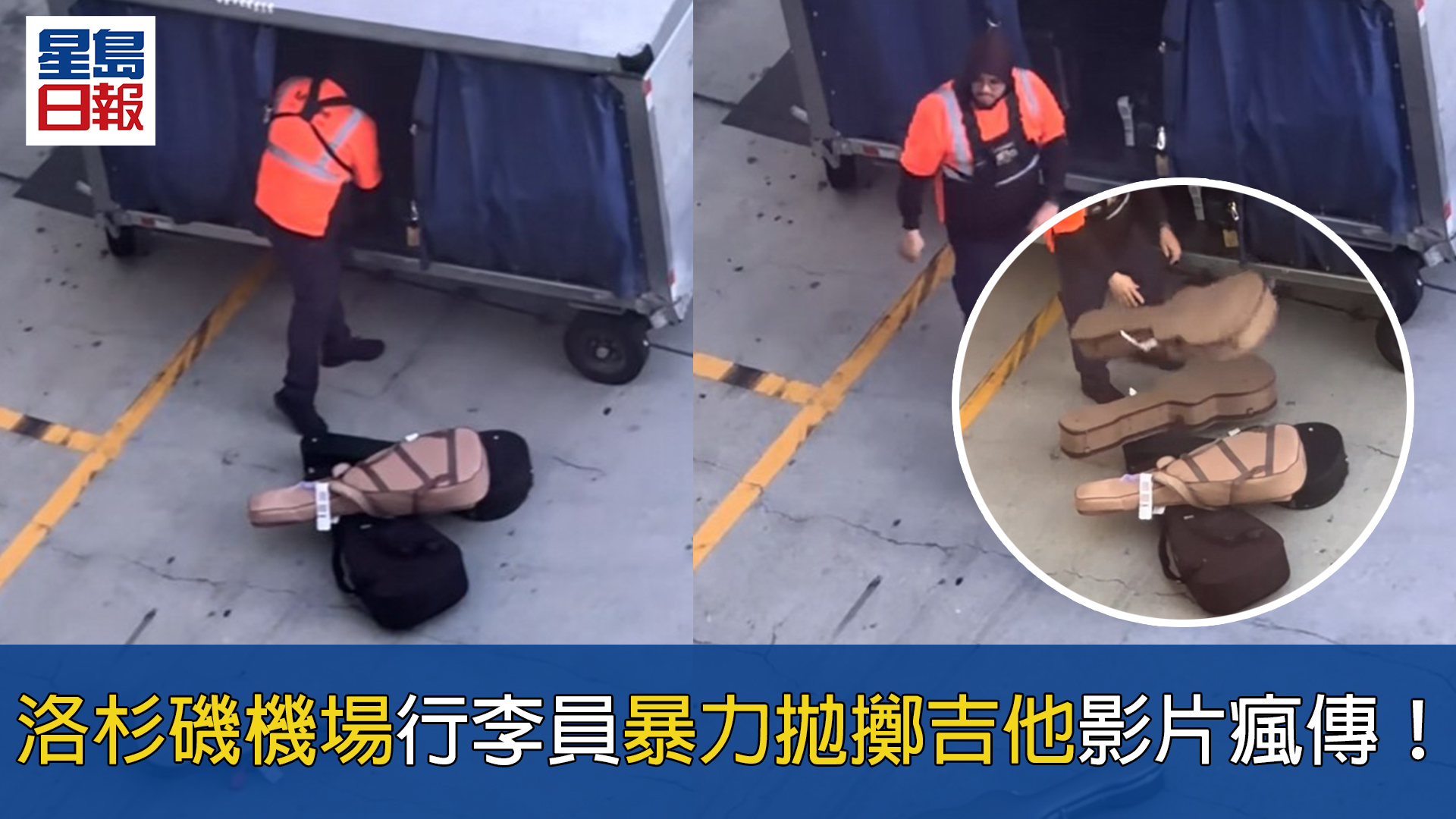 影片畫面顯示,該名行李員從移動行李車中取出多個吉他箱,並肆無忌憚地將它們猛力扔到跑道上的一堆行李中。