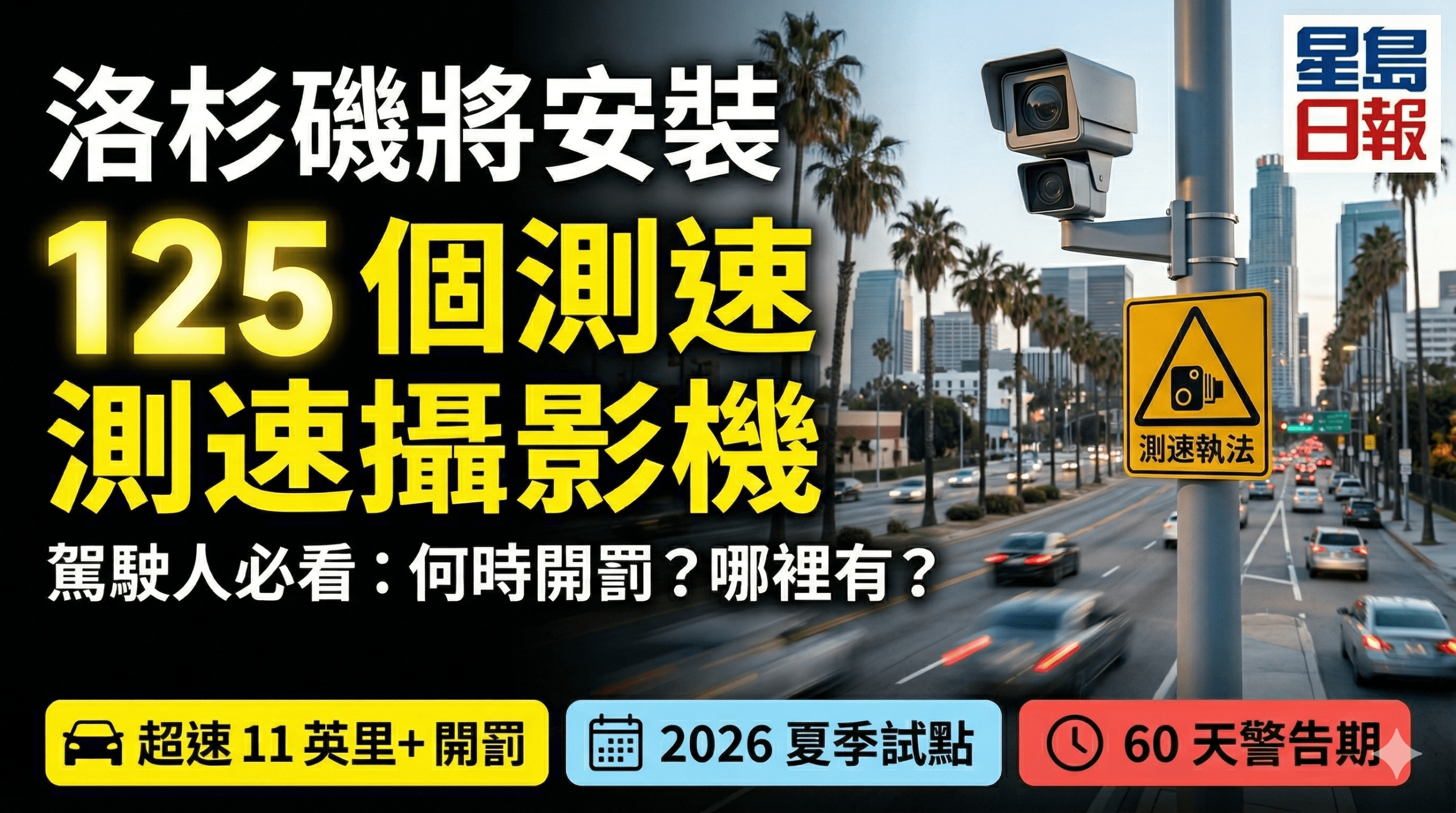 - 核心事件:洛杉磯市將安裝125個測速攝影機,鎖定超速11英里以上的車輛,並於今年稍晚開始正式開罰。