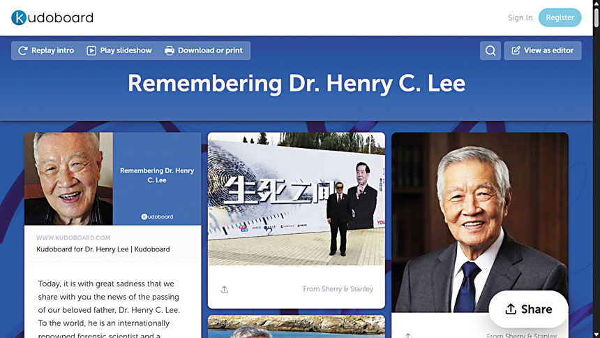 全球知名法醫鑑識專家、「華人神探」李昌鈺去世的消息傳出後,其子女發表聲明緬懷父親,同時在Kudoboard開設留言板,希望所有曾受李昌鈺博士影響過的人可以表達哀思或上傳照片。