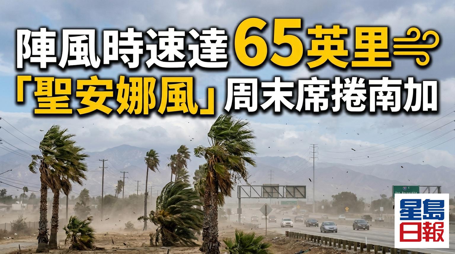 美國國家氣象局發出預警,強勁的「聖安娜風」(Santa Ana winds)預計從本週五開始侵襲南加州部分地區,陣風時速最高可達 50 至 60 英里。當局已針對西聖蓋博山脈及 14 號公路沿線發布強風警告,提醒市民留意停電風險及行車安全,預計這股離岸風將持續至週六。