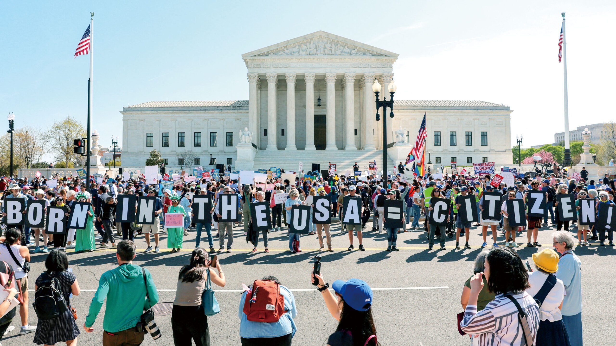 綜合《紐約時報》、《華盛頓郵報》報道,當日法庭外,晴朗的春日天空下,民眾湧入法院階梯前,揮舞美國國旗、高舉標語支持出生公民權。若高院認可政府政策,將影響每年多達25.5萬在美出生嬰兒的法律地位,還可能造成一個在美出生的無國籍兒童群體。