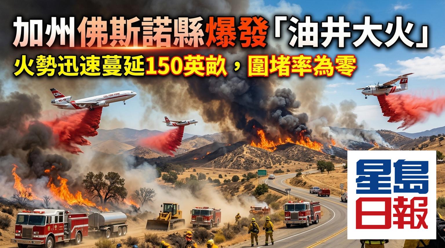 加州佛斯諾縣(Fresno County)週四上午發生名為「油井大火」(Well Fire)的荒野山火。火場位於科林加(Coalinga)附近的33號公路,起火僅兩小時內已迅速焚燒達150英畝。加州消防局(Cal Fire)已調派地面及空中部隊全力撲救,但截至週四下午,火場圍堵率仍然為零,起火原因尚在調查中。